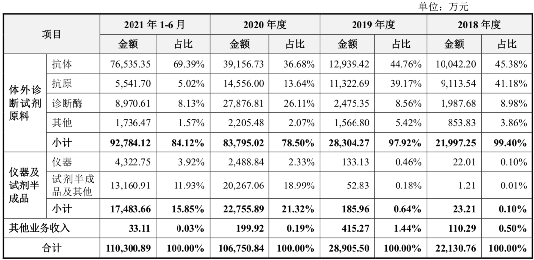3月3日,菲鹏生物股份有限公司(简称:菲鹏生物)创业板首发上会通过! ▲创业板上市委审议同意菲鹏生物发行上市(首发)(来源:深交所)3月3日消息,创业板上市委召开2022年第10次审议会议,审议同意菲鹏生物股份有限公司(以下简称“菲鹏生物”)发行上市(首发)。据悉,菲鹏生物上市申请于2020年12月25日获深交所创业板成功受理,拟募资25.056亿元。主要用于体外诊断试剂核心原料建设项目,体外诊断仪器及配套试剂解决方案研发、生产项目,研发中心技术平台建设项目;营销网络建设项目,以及用于补充流动资金。据悉,菲鹏生物创立于2001年,专业从事体外诊断试剂核心原材料研发、生产,是一家行业领先的体外诊断整体解决方案供应商。菲鹏生物建有化学发光、酶联免疫、荧光POCT、荧光实时PCR、基因测序、免疫比浊等一系列检测平台,开发体外诊断试剂原材料产品1200多种,包括抗原、抗体、诊断酶三大类,广泛用于免疫诊断、生化诊断、分子诊断、高通量测序等平台。近年财务数据招股书信息披露,菲鹏生物从2018年至2021年上半年的营收分别为2.21亿元、2.89亿元、10.68亿元和11.03亿元,同期归母净利润分别为0.40亿元、0.59亿元、6.33亿元和7.08亿元。▲菲鹏生物营业收入按产品类别划分(图源:菲鹏生物招股书)值得关注的,菲鹏生物的主营业务分为体外诊断试剂原料、试剂半成品与仪器两大类。其中,体外诊断试剂原料是其主要收入来源。招股书显示,体外诊断试剂原料从2018年至2020年为菲鹏生物带来的营收分别为2.20亿元、2.83亿元和8.38亿元,占当期收入的比重分别为99.40%、97.92%和78.50%。而仪器及试剂半成品这部分业务虽然占比较低,但是营收增长速度也是相当快。仪器及试剂半成品2018年的营收仅为23.21万元,而到了2020年该业务营收已达2.28亿元,已是2018年营收的980倍。公司化学发光仪器可兼容直接化学发光和酶促化学发光等主流检测体系,2020 年度销售 183台,2021 年上半年销售443 台,销售增长较快。2020年收入10.6亿,2021年H1收入11亿,原料收入占比仍然为80%左右,小部分是设备+试剂半成品。 与此同时,新冠肺炎疫情带动菲鹏生物业绩快速增长。新冠产品2020年度、2021年1-6月分别为菲鹏生物贡献6.97亿元、8.69亿元的收入,占当期营收的比重分别为65.44%、78.78%。▲新冠肺炎疫情带动菲鹏生物业绩快速增长(图源:菲鹏生物招股书)