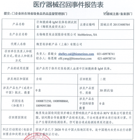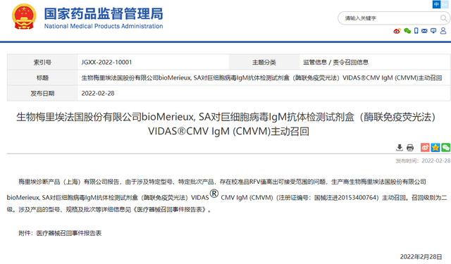 2月28日,国家药品监督管理局网站发布了生物梅里埃法国股份有限公司bioMerieux, SA对巨细胞病毒IgM抗体检测试剂盒(酶联免疫荧光法)VIDAS CMV IgM (CMVM)主动召回的公告。日前,梅里埃诊断产品(上海)有限公司报告,由于涉及特定型号、特定批次产品,存在校准品RFV值高出可接受范围的问题,生产商生物梅里埃法国股份有限公司bioMerieux, SA对巨细胞病毒IgM抗体检测试剂盒(酶联免疫荧光法)VIDAS CMV IgM (CMVM)(注册证编号:国械注进20153400764)主动召回。召回级别为二级。 本次召回的产品为巨细胞病毒IgM抗体检测试剂盒(酶联免疫荧光法)。该产品适用于体外性检测人血清中巨细胞病毒IgM抗体。该产品注册证或备案凭证编码为国械注进20153400764,生产企业为生物梅里埃法国股份有限公司bioMerieux, SA,代理人为梅里埃诊断产品(上海)有限公司。本次召回涉及地区和国家为全球;召回级别为二级;涉及产品型号、规格为30测试/盒;识别信息(如批号)为1008873250,1008988860,1009095380;涉及产品生产(或进口中国)批次、数量为0盒;涉及产品在中国的销售数量为0盒。 本次召回原因系梅里埃法国收到投诉并确认受影响批次产品校准品RFV值高出可接受范围,该问题会导至报警产品校准无效,不会对患者样本进行结果计算,不会产生错误的检测结果,但可能会造成检测结果延迟报告。 此外,因该产品已于2020年在中国大陆地区退市,故中国境内未受本次行动影响,无需纠正行动。 经中国经济网记者查询,2021年全球医疗器械公司百强榜中,生物梅里埃名列第29位,收入达到35.55亿美元。 生物梅里埃官网显示,生物梅里埃致力于为公共卫生提供支持以及生物学专业研究,公司创建于1963年,诊断系统由试剂、仪器和软件组成,主要围绕传染病、工业微生物控制、心血管病和肿瘤等四个战略领域来设计。公司目前经营产品超过2000余种,公司上市的所有产品均遵循同行业最高标准,并通过ISO国际质量认证。梅里埃在世界150个国家和地区设有分支办事机构、研究发展中心和制造工厂,业务遍及世界六大洲。 |