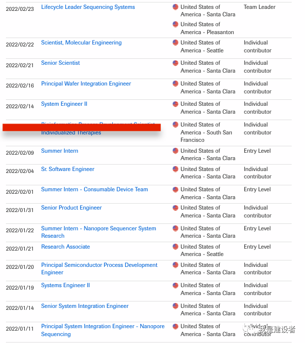 搜索罗氏正在招聘的职位可以发现,在过去的两个月中,罗氏密集发布了近20个跟纳米孔测序相关的工作机会,招聘力度比以往都大,提示了罗氏持续开发纳米孔测序的决心。这些工作机会以美国圣克拉拉和西雅图为主,其中罗氏诊断分子解决方案(Roche Molecular Systems)包括测序仪器的研发就集中在圣克拉拉,而西雅图则是罗氏2020年收购Stratos Genomics(斯特拉托斯)之后所保留的工作地点。从这些招聘所提示的信息上我们可能窥探罗氏正在开发的纳米孔测序的技术路线。 从招聘来看,罗氏正在从概念验证过渡到产品化阶段,招聘的岗位多集中在强调其纳米孔测序平台上开展测序工作流程所需设备的界定、设计、开发、集成和验证,包括样本制备平台、耗材、半导体/芯片/晶圆/电路、替代核苷酸(X-NTPs)、控制软件及数据端解决方案等,涵盖了多个关键的环节。这提示罗氏纳米孔测序已经完成了概念验证,开始为产品原型做准备。当然早期内部研究开发和收购所带来的概念/设备都构成了这一步跨越的前提。