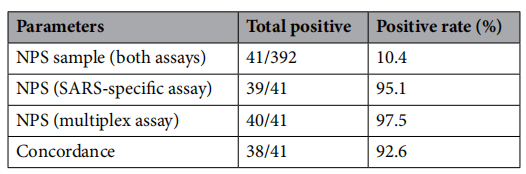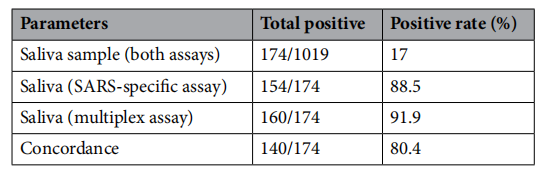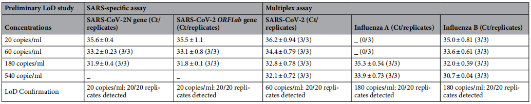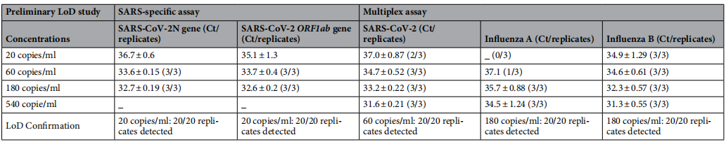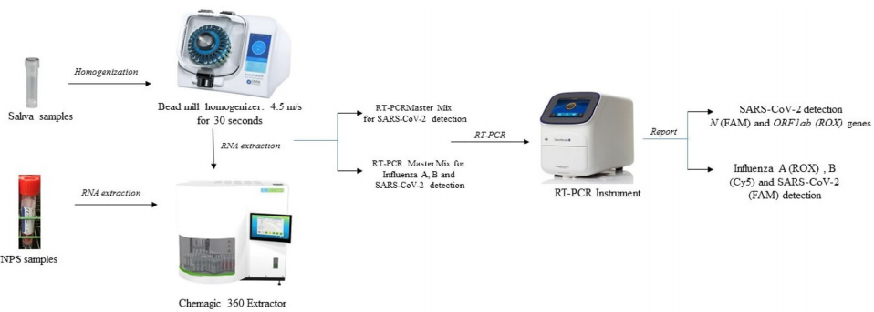 COVID2019冠状病毒疾病的爆发是一场大规模的流行病,并在全球范围内引发了重大的社会经济破坏。自2019冠状病毒疾病的确诊以来,全球共报告77343652例COVID-19病例,以及1702293相关死亡病例(截止2020年12月21日)。为了遏制疾病的传播,SARS-CoV-2检测被确定为最重要的一项措施。重大的紧急政策变化以及国家资助促进了美国和世界各地病毒检测的实施。然而,由于人员、资源和物资被转移到SARS-CoV-2检测中,通常导至季节性呼吸道感染的病毒病原体的检测已被边缘化。急性呼吸道感染(ARTIS)仍然是传染病发病率和死亡率的主要原因。全球疾病负担(2017)数据已经证明,流感造成了11.5%的下呼吸道感染(LRTIs),在一个日历年内,导至所有年龄组的900多万人住院,14.5万人死亡。此外,在当前大流行中,与细菌、真菌或病毒病原体的共同感染与疾病严重程度和死亡有关。从武汉调研的冠状病毒疾病报告显示,80%的COVID-19患者与至少一种呼吸道病原体共感染,最常见的是A和B型流感病毒(分别为60%和53.30%)。忽视这些共同传播的病原体,尤其是流感A和B病毒,在临床和流行病学水平上造成了严重的公共卫生问题。在当前的流感季节,共同传播的呼吸道病毒病原体的潜在影响是当地和国际公共卫生水平的主要关注点。此外,随着冠状病毒疫苗的使用,除了SARS COV-2之外,病原体的检测,尤其是流感病毒已经成为下一个诊断测试的紧急事件。 大流行已经在重定向工作流程、工作人员、供应和验证新诊断测试的层面上对常规临床诊断实验室造成了重大改变。直到最近几个月,实验室才流程化了SARS-CoV-2的检测,因此,转向新的工作流程并实施新的诊断检测,只会让已经精疲力竭的实验室工作人员感到不安。 为了应对这些临床和技术挑战,几个来自美国和肯尼亚的研究团队在Scientific reports上发表了一篇题为“Clinical validation of a multiplex PCR-based detection assay using saliva or nasopharyngeal samples for SARS-Cov-2, influenza A and B”的文章,在这篇文章中,研究团队优化并验证了一种基于高灵敏度RT-PCR的多重检测方法,用于在一次检测中检测SARS-CoV-2、流感A和B病毒,使用了目前用于SARS-CoV-2检测的相同工作流程、仪器、样本类型、仪器和实验室人员。此外,文章中还对鼻咽拭子(NPS)和唾液样本进行了验证,与FDA-EUA比较试验(仅SARS-CoV-2检测)相比,该试验在检测SARS-CoV-2病毒方面具有更高的灵敏度。结果显示,这种新型的多重检测方法可以用于筛查流感病毒,同时检测SARS-CoV-2,并且可以在全球各地的实验室中轻松实施,使用基本相同的工作流程和快速周转时间(TAT)。 图片来源:Scientific reports 主要内容 1. 多重检测方法的主要流程与SARS-CoV-2一致 为了增加临床负担和技术挑战,研究团队优化了一种基于高灵敏度RT-PCR的多重检测方法,用于在一次检测中检测SARS-CoV-2、甲型和乙型流感病毒,与目前用于SARS-CoV-2检测使用相同的工作流程、仪器、样本类型、仪器和实验室人员。 SARS特异性检测和多重检测的唾液和NPS样本处理步骤示意图 图片来源:Scientific reports 2. 临床表现:唾液样本。 在1019份唾液样本中,17.0%(174/1019)的SARS-CoV-2检测呈阳性。与SARS特异性检测法相比,多重检测法对SARS-CoV-2的检测率更高[91.9%(160/174)对87.9%(153/174)]。两项检测的阳性结果一致性为80.4%(140/174)。SARS-CoV-2的Ct值在两种检测方法之间具有可比性(SARS-CoV-2: 29.2±7.2 vs. N :29.8±6.4,ORF1ab:28.0±7.1),而与SARS特异性检测方法相比,多重检测方法的house-keeping基因的Ct值显著更低[RNaseP: 20.6±2.05 vs. IC: 32.5±2.0(p<0.001)]。此外,与SARS特异性检测相比,多重检测导至无效的检测次数显著减少[1.7%(18/1019)对5.6%(58/1019)(p<0.001)]。没有样本对甲型或乙型流感呈阳性。 唾液样本的总体检测率和特异性检测率以及两种检测方法的一致性数据。图片来源:Scientific reports 3. 临床表现:NPS样本。 在392份唾液样本中,10.4%(41/392)的SARS-CoV-2检测呈阳性。与SARS特异性检测法相比,多重检测法对SARS-CoV-2的检测率更高[97.5%(40/41)vs.95.1%(39/41)]。两项检测的阳性结果一致性为92.6%(38/41)(表2)。SARS-CoV-2的Ct值在两种检测方法之间具有可比性(SARS-CoV-2 :30.8±8.8 vs. N: 31.3±8.6,ORF1ab:28.8±8.6),而与SARS特异性检测方法相比,多重检测方法的管家基因Ct值显著更低[RNaseP:23.1±1.77 vs.IC: 31.3±1.5(p<0.001)](图3)。没有样本对甲型或乙型流感呈阳性。 NPS样本的总体和特异性检测率以及两次分析之间的一致性数据。图片来源:Scientific reports 4. 检测限研究:唾液样本。 在使用唾液样本进行的初步LoD研究中,SARS-CoV-2的所有重复样本均以60、180和540拷贝/毫升的浓度检测到,因此LoD被确定为以60拷贝/毫升,20/20所有重复样本被检测出。流感A和B的初步LoD评估检测到了B型流感四种浓度下的重复样本,所有180和540拷贝/毫升的重复样本对B型流感检测呈阳性。A型流感和B型流感病毒的LoD均为180拷贝/毫升,20/20所有重复样本被检测到(表3)。 两种检测方法在唾液样本中的多重检测限 图片来源:Scientific reports 5. 检测限研究:NPS样本。 在使用NPS样本进行的初步LoD研究中,SARS-CoV-2在四种测试浓度(20、60、180和540拷贝/毫升)下的所有重复样本被检出,LoD被确定为60拷贝/毫升,20/20所有重复样本被检测出。流感A和B的初步LoD评估检测到了所有在四种浓度下的流感B病毒重复样本,而所有在180和540拷贝/毫升下的流感B病毒重复样本都被检测到。流感A和B病毒的LoD都被确定为180拷贝/毫升,