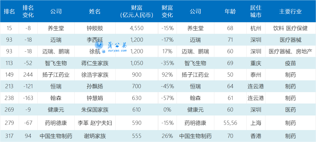 3月17日,胡润研究院发布《2022胡润全球富豪榜》,其中,特斯拉的埃隆·马斯克以1.29万亿元人民币连续第二年成为世界首富,财富比去年增长了4%。亚马逊的杰夫·贝佐斯以1.19万亿元位居第二,比去年下降了1%。LVMH的伯纳德·阿诺特增加了2000多亿元,以9650亿元位居第三。养生堂的钟睒睒财富虽然下降了近1000亿元人民币,但仍以4550亿元人民币的财富蝉联中国首富,全球排名第15位。从人数来看,医疗健康行业首次超过房地产排名第二,而零售超过消费品排名第四。下降较多的主要是中国的互联网、房地产、教育、仿制药和电子烟行业等。本次2022胡润全球富豪榜进入前100名的有31位,其中有3位进入了榜单前100,第15名农夫山泉的钟睒睒;第93名迈瑞的李西延、迈瑞、鹏瑞的徐航。 养生堂的钟睒睒财富虽然下降了近1000亿元人民币,但仍以4550亿元人民币的财富蝉联中国首富,全球排名第15位。迈瑞的李西延、迈瑞、鹏瑞的徐航以1200亿元人民币的财富并列第二名;智飞生物的蒋仁生家族以1050亿元人民币的财富位居第四名。第5-10名的依次是扬子江药业的徐浩宇家族(财富900亿元);恒瑞的孙飘扬(财富700亿元);翰森的钟慧娟(财富630亿元); 健康元的朱保国家族 (财富610亿元);药明德康的李革、赵宁夫妇(财富590亿元)、中国生物制药的谢炳家族(财富555亿元)。与去年相比,排名普遍下降,其中前300名中,只有扬子江药业的徐浩宇家族位列第149名,上升244名。其他均不同的下降:养生堂的钟賧賧位列第15名(排名下降了8名);迈瑞的李西延和迈瑞、鹏瑞的徐航并列第93名(排名下降了18名);智飞生物的蒋仁生家族位列第113名(排名下降了52名);恒瑞医药孙飘扬位列213名(排名下降了121名),瀚森制药钟慧娟位列238名(排名下降了163名),健康元药业朱保国位列269名(排名下降了9名),药明康德李革、赵宁夫妇位列279名(排名下降了67名)。 养生堂的钟睒睒直接和间接持有农夫山泉共84.41%股权。2020年9月8日,农夫山泉在港交所上市,股价高开超过80%。这一表现让农夫山泉瞬间成为“造富神话”,钟睒睒也借此登上中国首富的宝座。2020年4月,万泰生物登陆上交所,以逾21倍的涨幅成为2020年A股市场表现最佳的新股之一。2021年,农夫山泉和万泰生物的业绩较上一年度均有一定增长,但受资本市场近期整体表现不佳影响,市值有所下跌。在2021嘉兴·胡润世界500强榜单中,农夫山泉排在第255位。李西廷和徐航是迈瑞医疗的七位创始人中的其中两位。迈瑞医疗成立于1991年,是中国最大、全球领先的医疗器械以及解决方案供应商,主要产品覆盖三大领域:生命信息与支持、体外诊断以及医学影像。 据迈瑞医疗发布的2021年半年报,2021年1-6月迈瑞医疗实现营业收入127.78亿元,同比增长20.96%,归属于上市公司股东净利润为43.44亿元,同比增长25.79%。除了稳健的业绩外,从其半年报披露可以看出,迈瑞医疗在海外市场、尤其是国际高端客户群体中不断取得突破。蒋仁生是智飞生物的公司控股股东,智飞生物发布的2021年业绩快报,经过初步核算,公司去年实现营业收入306.37亿元,同比增长101.68%;营业利润119.86亿元,同比增长207.73%。近些年,其研发投入不断加大,2016年至2020年,研发投入由0.76亿元增至4.81亿元,2021年上半年研发投入再增至7.90亿元。智飞生物作为全球重要的疫苗研发与供应商,目前已搭建起细菌性多糖和多糖蛋白结合疫苗技术平台、病毒性灭活疫苗技术平台、基因重组技术平台、组分技术平台等多个研发平台,及布局mRNA、新型多联多价前沿开发平台,处于临床试验阶段及临床前研究项目共26项,覆盖预防结核病、肺炎、脑膜炎、流感、狂犬病等传染病的人用疫苗、生物制品项目。 而排名上升的扬子江药业徐浩宇去年7月29日宣布接班。2021年,国家药监局共批准了900多个国产仿制药批文(含仿制3/4/6类,不含原料药),其中扬子江药业共有27个仿制药首次获批上市,总数位列第一。2022年中国医药富豪排行榜 本次2022胡润全球富豪榜进入前100名的有31位,均为老面孔,排名上升的共11位,其中神州细胞的谢良志、李翰园夫妇排名上升最多,上升了1029名;下降最多的为排名874名的恒瑞、翰森的岑均达,下降了554名。上榜企业家财富计算截止日期为2022年1月14日。