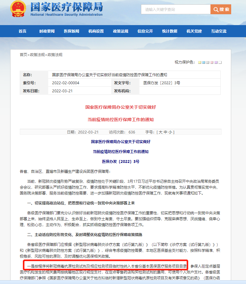 今日要闻 3月21日,国家医疗保障局办公室发布《关于切实做好当前疫情防控医疗保障工作的通知》,要求各省级医疗保障部门应根据《新型冠状病毒肺炎诊疗方案(试行第九版)》(以下简称《诊疗方案(试行第九版)》)和《新型冠状病毒肺炎防控方案(试行第九版)》,综合考虑疫情防控需要、本地区医保基金支付能力,按照科学精准、积极稳妥、风险可控的原则,及时调整优化医保相关政策。其中,要按程序将新冠病毒抗原检测试剂及相应检测项目临时性纳入本省份基本医保医疗服务项目目录。