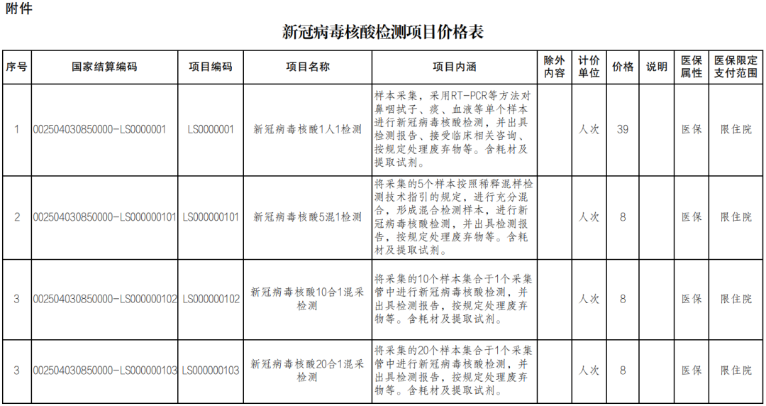 二、公立医疗机构按照卫生健康部门技术规范进行的新型冠状病毒核酸混合检测,不区分样本数量,最高价格为6元/人次,不得另外收取检测试剂等其他费用。