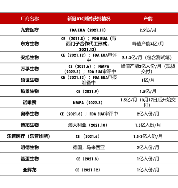 (1)主材:主要为抗原抗体、硝酸纤维素膜(以下简称NC 膜)、PVC 胶板等;抗原抗体。新冠抗原检测试剂盒中的抗体原料一般是以重组N 蛋白或者S 蛋白作为免疫原的抗体试剂。Spike(S)抗原和Nucleocapsid(N)抗原是新冠病毒两个重点靶点抗原。其中,N 蛋白保守性更好且在病毒中含量最高,因此N 蛋白是免疫诊断试剂开发的重要靶点。相关公司包含上市的诺唯赞、义翘神州、百普赛斯、优宁维、菲鹏生物(拟上市)等,还有一些海外供应商R&D、PeproTech 等。NC 膜。硝酸纤维素膜的简称,在胶体金试纸中用做C/T 线的承载体,同时也是免疫反应的发生处。目前供应商有MILLIPORE(美国)、WHATMANand S&S、 SARTORIUS(德国)、伊能(国产)、MDI(印度)、汕头润和生物(外资独资)等。(2)辅材:种类与数量较多,以塑料件为主,有如瓶盖、滴头、卡壳等。相关的生产企业较多,上市公司中包含拱东医疗、昌红科技、阳普医疗、基蛋生物等;(3)包材:主要为铝箔袋、纸盒等包装物,相对壁垒不高,生产厂家较多,供应商也多为印刷公司,上市公司中包含海顺新材、环球印务、科瑞技术等。上游产业链成本拆分上,参考试剂盒生产企业安旭生物的2021 年上半年原材料采购表作为参考,该公司招股说明书中提到,2021 年上半年公司产品以新冠抗原检测试剂为主。该期间内,安旭生物整体的销售成本率为40.63%,成本拆分为抗原抗体占比27%,NC 膜及PVC 胶板占比5%,辅助材料占比34%,包装材料占比12%。其中,NC膜是新冠快速筛检试剂中一项至关重要的材料,保质期只有一年,无法储存,曾在2021年期间出现过缺货现象。从全球范围来看,目前已有200 多家企业新冠抗原试剂盒上市销售,其中国产品牌凭借行业领先的检验效果以及生产供应能力迅速占领海外市场,获批数量占半数以上。中国新冠抗原检测自检类试剂盒批准时间较欧洲、美国等地区晚,我国部分公司的抗原检测产品也已在欧洲或美国得到批准并市场销售。按照海关总署的数据,2021 年全年,中国新冠检测试剂盒(核酸检测+抗体检测+抗原检测)合计出口金额约714 亿元,浙江、福建和广东是主要的出口省份,进口国家主要是德国和英国。欧洲市场用于家用检测抗原检测试剂产品较多,价格战激烈,终端价格约在2-3欧元左右。按照东方生物电话会议纪要,欧洲2021年上半年家庭自测产品的供应商竞争、价格竞争非常激烈,很多公司到6月份之后终端价格杀到1美金不到。以德国为例,我国的艾康生物、安旭生物、万泰生物、热景生物、明德生物、博拓生物等公司产品均被德国药监局批准用于家用,其他公司如万孚生物、亚辉龙、东方生物、乐普生物等产品也获得CE 认证。美国市场FDA 对家用新冠抗原检测试剂盒的审批较为严格,市场竞争格局较优。同一会议纪要显示,美国市场对于单价不要抱有幻想,目前政府采购价是4-5美金,还有下降空间,1月份产能是3亿份,出厂价1.2-1.5美金每份。截至2021 年年底,美国共有9 家新冠抗原检测产品获得FDA 的应急使用授权(EUA)资质,其中不乏诊断巨头如Abbott(雅培)和BD,以及专注于POCT 领域的Quidel 等公司。我国仅有三家公司拿到美国的EUA,分别是艾康生物、九安医疗和东方生物(为西门子的代工商)。截至2022 年3 月13 日,我国NMPA 批准的新冠抗原自检类试剂盒共有6款(其中五款为变更原注册文件),生产厂家分别是万孚生物、华大因源、诺唯赞、北京金沃夫生物、北京华科泰生物技术股份有限公司和热景生物。考虑到中国国内抗原检测潜在需求,预计已经拿到CE 认证和美国EUA 证的公司也会加速在国内进行注册申请。国内定价方面,参考广东招采价格,新冠抗原检测试剂盒中标价位16.8 元/人份。但也需要注意的是,抗原自检产品的企业入门门槛不高,竞争优势更多来源于审批速度,可以预见未来一段时间将有不少企业获批抗原自检产品,这或许这两年因为新冠爆发的IVD企业最后一波赚“快钱”的机会。展望未来,这些在新冠中暴赚的IVD公司如何利用好手中积累的巨额资本,包括但不限于自研、代理和并购等手段,进行新的产品管线布局,才是IVD行业发展历程中最为难得的一次“逆天改命”的产业洗牌机会。实际上这样的产业并购和行业整合在2021年已经开始了!2021年IVD行业最典型的收购案例当属Quidel以60亿美元收购奥森多。疫情之前的2019年,Quidel的年度营收才超过5亿美元,但2020年Quidel的年度营收直接翻了3倍,达到16.6亿美元,同期毛利高达13.5亿美元,2021年Quidel的营收保持高位,2021年前三个季度的总营收达到10.1亿美元,前三季度的毛利高达7.8亿美元。2021年年底,Quidel宣布收购有着80多年历史的老牌IVD企业奥森多,立即超越希森美康、豪洛捷、珀金埃尔默,以34亿美元营收站上全球IVD行业第七的排位。国内市场,圣湘生物2021年5月计划19.5亿收购科华生物18.63%股份,并成为第一大股东,虽后因股权转让过户事宜终止,但也看出其产业拓展的计划。
