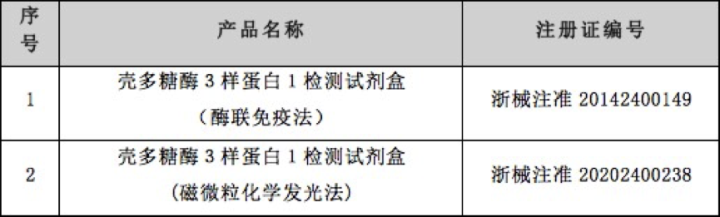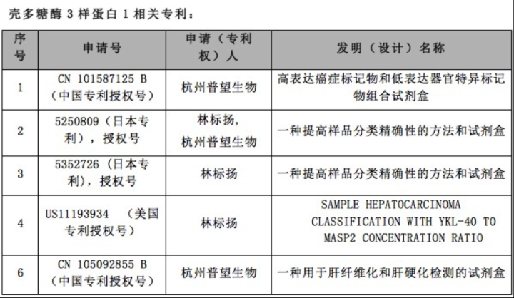 目前,普望生物及林标扬拥有多个“壳多糖酶3样蛋白1”的国内国际专利。相关专利产品也已分别于2014年和2020年取得医疗器械注册编号,高危人群(如乙肝,丙肝,脂肪肝人群)可以通过试剂来检测。