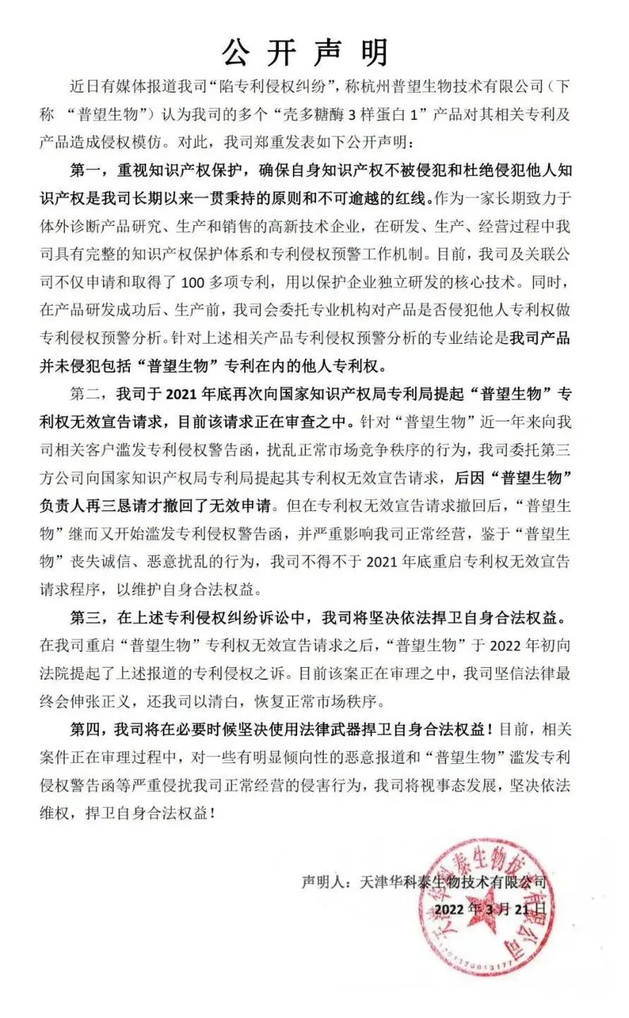 3月21日,天津华科泰发布公开声明,称并未侵权。