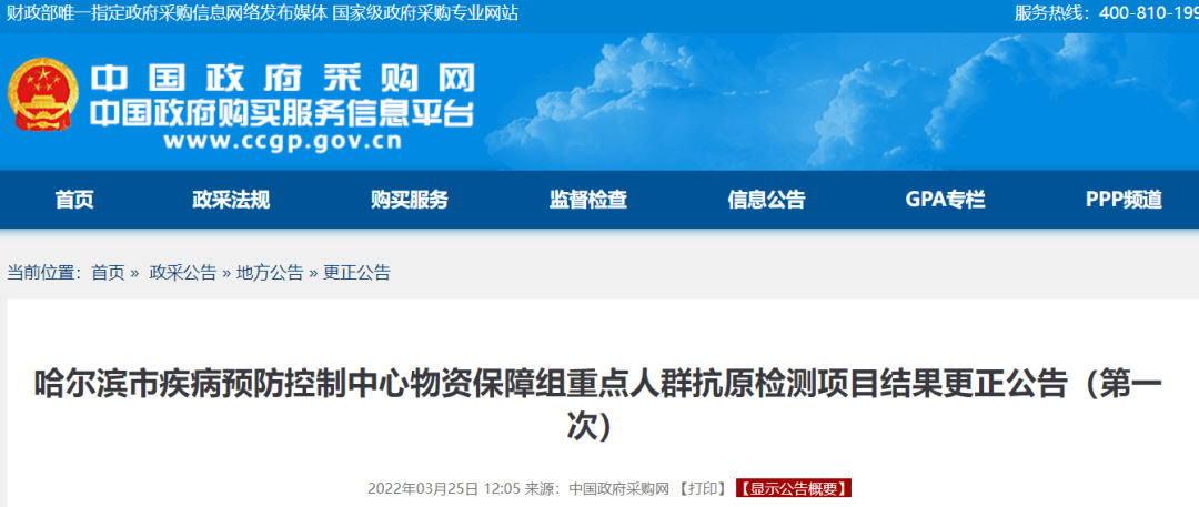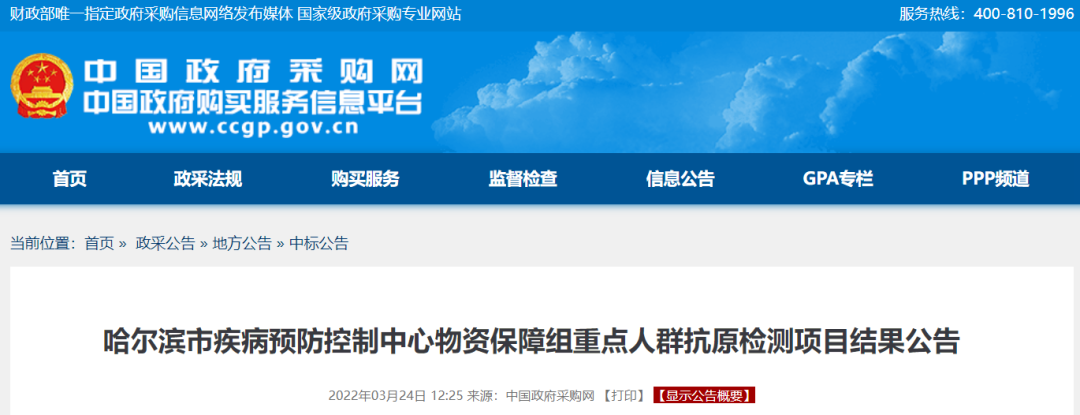 3月24日,中国政府采购网公布哈尔滨市疾病预防控制中心物资保障组重点人群抗原检测项目结果公告。