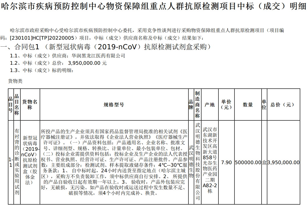 中标公告结果显示:中标单价为7.5,共计50万人份,总价3750000。中标品牌为:深圳亚辉龙;中标供应商为:哈尔滨市英诺特生物科技有限公司。 随后,3月25日,中国政府采购网公布哈尔滨市疾病预防控制中心物资保障组重点人群抗原检测项目结果更正公告(第一次)
