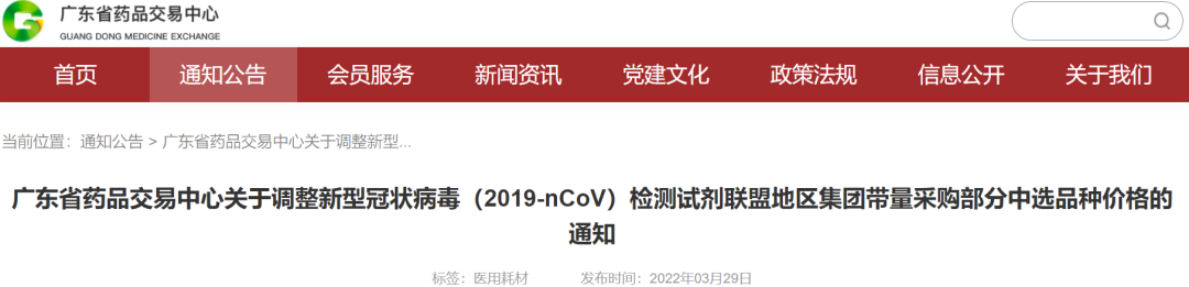根据《广东省医疗保障局关于调整新冠病毒检测试剂联盟集采个别品种中选价格的通知》(粤医保便函[2022] 393号)有关要求,自2022年3月29日正式执行调整后价格,我中心已按照相关中选企业主动申请降低的价格调整对应产品的价格。