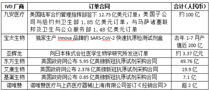 3月21日,英国政府网公布了3份新冠抗原试剂采购合同的信息,东方生物、艾康生物、基蛋生物分别间接获得5.95亿英镑、2.378亿英镑、0.85亿英镑的合同,三份合同涉及金额共9.18亿英镑,都是从2月23日开始,截止时间均是8月20日。