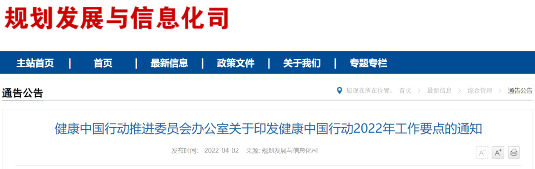 2022年4月2日,国家卫健委规划发展与信息化司发布《健康中国行动推进委员会办公室关于印发健康中国行动2022年工作要点的通知》