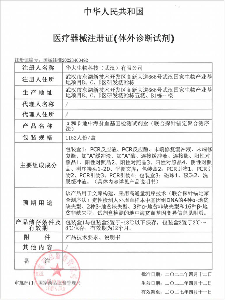 近日,深圳华大基因股份有限公司全资子公司华大生物科技(武汉)有限公司的α和β地中海贫血基因检测试剂盒(联合探针锚定聚合测序法)取得了国家药品监督管理局颁发的医疗器械注册证,是国内率先获批的基于高通量测序技术的地中海贫血的基因检测试剂盒,可以一次性同时检测α和β地中海贫血的缺失型和非缺失型变异,填补了国内β地中海贫血基因缺失型检测的空白。该试剂盒具有检测灵敏度和特异性高、多测序平台通量配置灵活等特点,可满足临床用户的多样化和个性化需求。