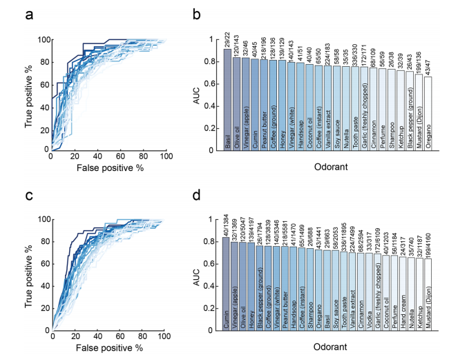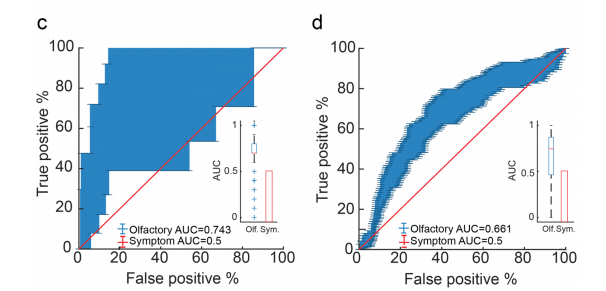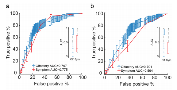 2019冠状病毒疾病已经严重破坏了世界秩序。有效应对大流行的一个必要工具是大规模、快速和廉价的筛查方法。由于国家医疗系统已经超负荷运转,理想的筛查工具应该是不需要运输、传播和处理体检的工具。一个备受关注的替代方案是,通过电话线记录的咳嗽声或嘶哑声音(AI咳嗽)进行人工智能诊断的可能性。第二种选择是在线主观自我报告症状检查,这确实产生了一些显著的结果。虽然这两种方法都满足了广泛的容易管理的筛查方案的需要,但它们都在两个关键点上失败:第一个是无法区分患病的个体和感染了新冠的患者。如果一个人咳嗽,发烧,头痛,目前的AI咳嗽和症状检查者最有可能估计他们有COVID-19,即使他们没有。第二个是COVID-19的无症状感染者。这些人占所有感染者的约30%,不会被当前的AI咳嗽和症状检查发现。矛盾的是,从流行病学的角度来看,这些人可能是最令人担忧的,因为他们可能会无意中传播疾病。 除了主观症状报告之外,另一种方法是基于客观表现的测试,嗅觉在这方面提供了一个特别有吸引力的目标。有两个原因:第一,嗅觉丧失和/或改变已被广泛认为是COVID-19的高度流行的早期症状。其次,大多数人都有现成的家用气味剂可供检测。事实上,一个由临床医生和基础科学家组成的大型联盟称为GCCR已经着手研究2019冠状病毒疾病的嗅觉,并有说服力地建立嗅觉作为标记。此外,在主观上注意到嗅觉丧失的情况下,这本身就是新冠病毒的有力标志。也就是说,嗅觉作为主观无症状个体(即从流行病学角度来看最令人担忧的群体)的标记物的能力尚未得到测试,这些个体没有嗅觉丧失的主观感觉。主观上无症状的个体不知道他们可能有任何嗅觉变化或损伤,所以所使用的测试需要对可能是潜意识的知觉变化特别敏感。最近开发的嗅觉感知指纹(OPF)正是这样一种仪器。因为它本身不是一个性能指标(例如,检测/辨别/识别的分数),而是一个感知量化物,它有效地利用了感知中微小的潜意识变化。 一组来自全世界各地的研究团队在杂志COMMUNICATIONS MEDICINE上发表了一篇题为“An olfactory self-test effectively screens for COVID-19”的文章。研究团队的假设是,OPF可以允许准确分类COVID-19阳性但没有症状的人,或COVID-19阴性但有(其他)疾病的症状。为了验证这些假设,研究团队建立了一个在线工具来报告嗅觉感知。研究团队报告的结果来自13484个参与者(462 COVID-19阳性),来自134个国家提供了178820个家庭60种不同气味的感知评级。研究团队观察到嗅觉评级表明COVID-19在一个国家的传播情况,与国家感染率随着时间的推移显著相关。而且观察到个体水平上的指示力(79%的敏感性和87%的特异性)。最关键的是,与研究团队的假设一致,这种嗅觉筛查在COVID-19无症状参与者,和在有症状但没有COVID-19的参与者中仍然有效。 图片来源:Communications medicine 主要内容 嗅觉感知表明2019冠状病毒疾病在人群中的传播水平 在2020年3月25日至2020年9月23日期间,从居住在134个国家的12020个人(7189名女性,平均年龄=44.32±14.28,4831名男性,平均年龄=45.23±15.29)中收集了数据。其中348名参与者2019冠状病毒疾病阳性(C19+),400名受试者报告阴性结果(C19−), 其余11272名参与者的状态未知(C19-UD)。91.1%的C19+参与者和55.3%的C19-参与者以及55%的C19-UD参与者报告至少存在一种疾病症状。总共,12020名参与者提供了171500个评级,适用于60种不同的气味剂。 为了探索C19+、C19−和C19-UD之间嗅觉感知的任何显著差异, ,研究团队绘制了它们的总体气味强度和愉悦度估计。与之前的报告一致,这些总体图显示各组在强度上和愉悦度存在显著差异。 嗅觉感知表明2019冠状病毒疾病在人群中的水平 图片来源:Communications medicine 嗅觉感知在个体水平上显示COVID-19 研究团队接下来探索是否可以提供一个个人COVID-19的指示。研究团队观察到有意义的分类潜力,七种气味产生的ROC曲线下面积(AUC)大于0.8。最引人注目的是有气味的Basil罗勒,其AUC为0.91,在62%的真阳性率,保持显著低的5%的假阳性率,62%的敏感性,95%的特异性;在更保守的79%真阳性率下,保留了适度的13%假阳性率,79%的敏感性和87%的特异性。选择79%的真阳性率仍然意味着21%的假阴性率。这种平衡反映了一个政策问题,在这场大流行中,支持低假阴性率可能是首选。考虑到这一点,如果选择97%的真阳性率,会产生27%的假阳性率,97%的敏感性和73%的特异性。这反映了3%的假阴性率,在测试的最佳目标范围内。 上述结果的一个局限性是,它依赖于数据的一个有限子集,即也闻过罗勒的受试个体。为了克服这个问题,研究团队重新计算了ROC,现在比较C19+和所有其他参与者(C19-与C19-UD结合),这样允许每个气味剂的样本量更大。再次观察到有意义的ROC,四种气味产生的ROC的AUC大于0.79。最强的是孜然,其AUC为0.83,在77%的真阳性率下,保留16%的假阳性率,77%的敏感性和84%的特异性。橄榄油的AUC为0.79,如果单独使用橄榄油来鉴定COVID-19,在77%的真阳性率下,保留了28%的假阳性率,77%的敏感性和72%的特异性。 单一气味强度在个体水平上显示COVID-19 图片来源:Communications medicine 单一气味嗅觉检测VS症状检查 这些结果提高了2019冠状病毒疾病的快速检测的可能性,通过对一种气味剂的强度进行评估,例如罗勒或橄榄油。此外,研究团队观察到,如果为闻过橄榄油的5167名参与者生成ROC,但基于他们的主观报告症状(发烧、咳嗽