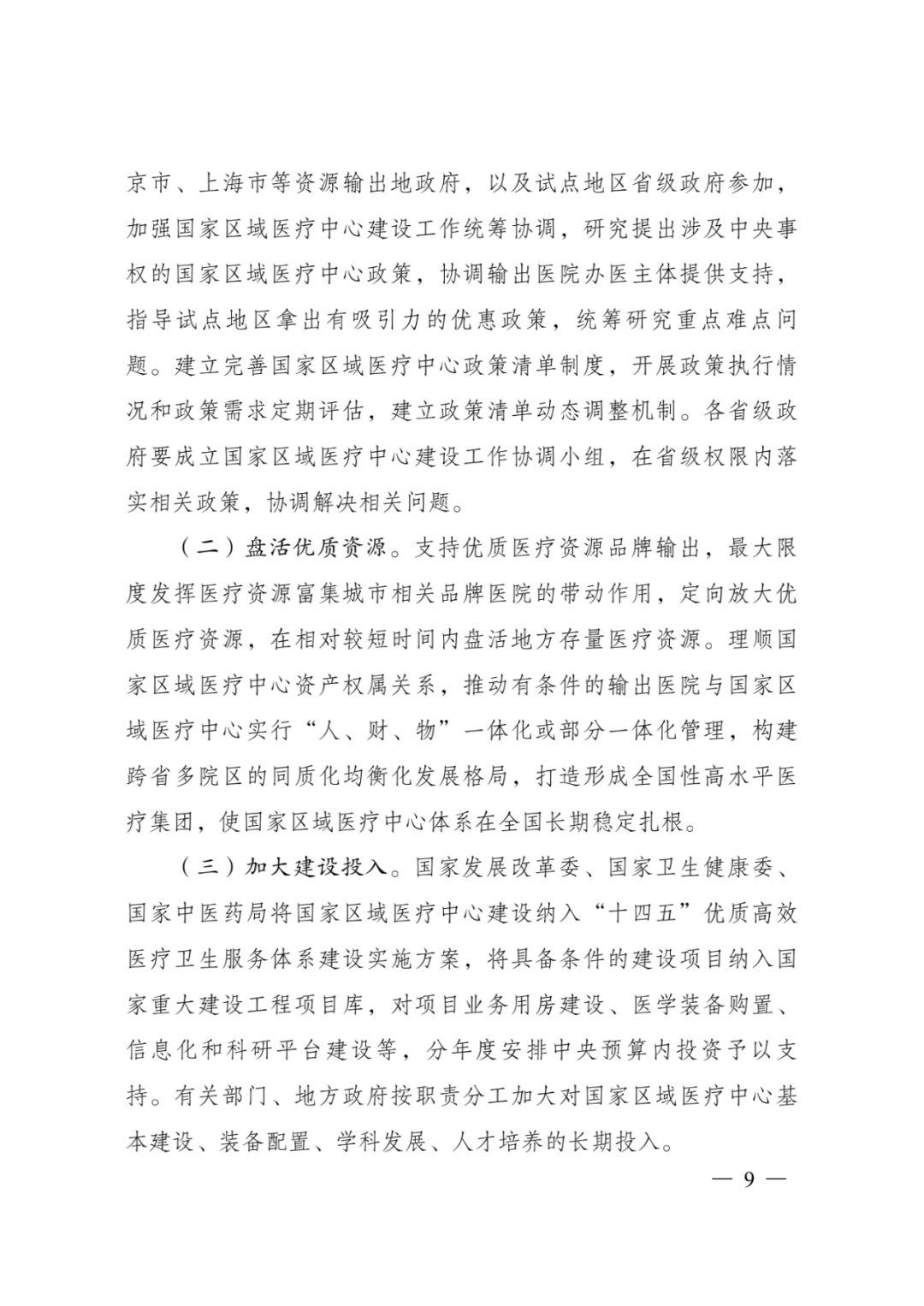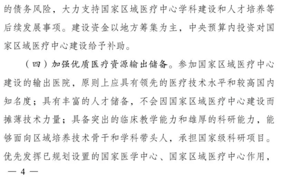 《通知》表示,将国家区域医疗中心建设纳入“十四五”优质高效医疗卫生服务体系建设实施方案,将具备条件的建设项目纳入国家重大建设工程项目库,对项目业务用房建设、医学装备购置、信息化和科研平台建设等,分年度安排中央预算内投资予以支持。有关部门、地方政府按职责分工加大对国家区域医疗中心基本建设、装备配置、学科发展、人才培养的长期投入。