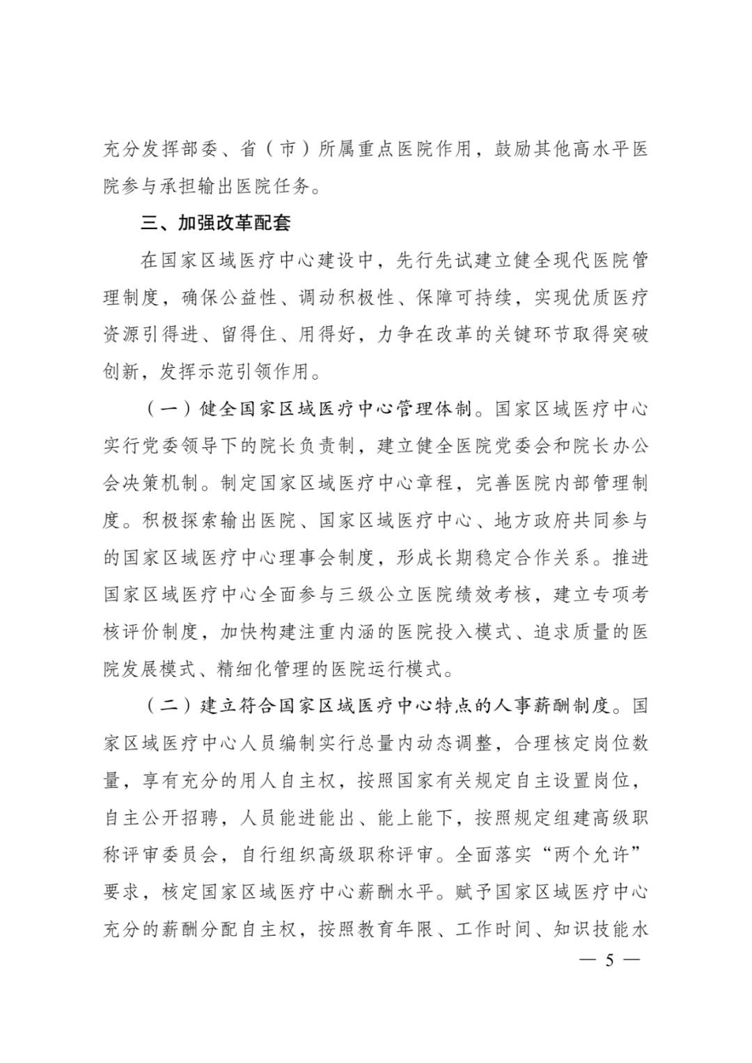 原则是“地方政府主建、输出医院主营、依托医院配合”,地方政府和输出医院通过双向选择、自愿合作,以保障基本医疗卫生服务公益性为首要原则,举办独立医疗机构,依托当地现有医疗资源,引入输出医院优质医疗资源,授权输出医院统筹调度依托医院人、财、物等相关资源,尽快达到国家区域医疗中心设置标准。
