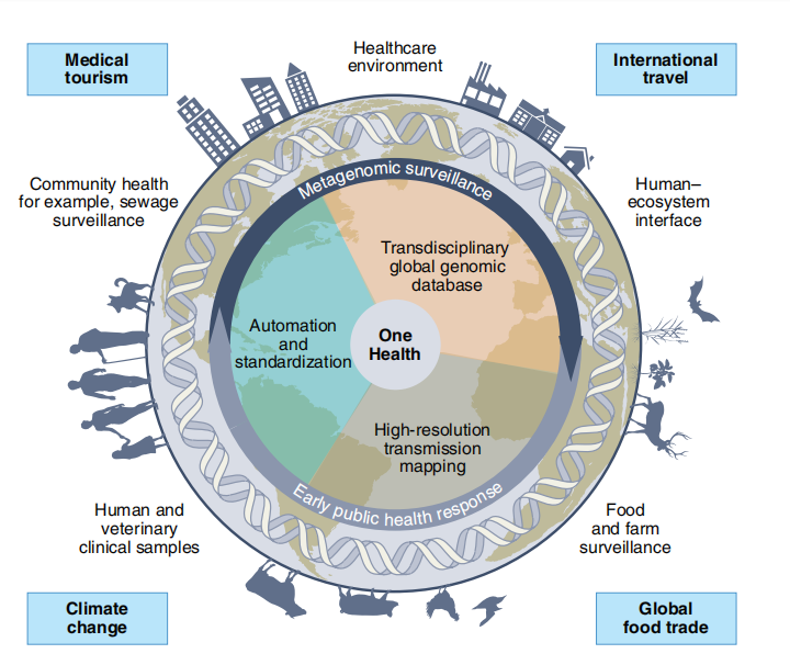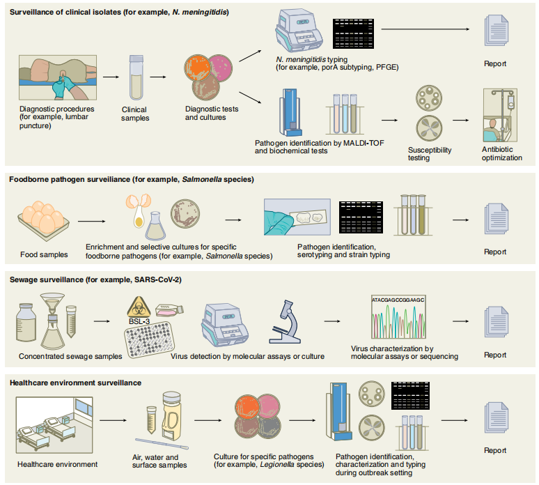 近日,来自新加坡的一组研究团队在Nature microbiology杂志上发表了一篇题为“Metagenomics-enabled microbial surveillance”的文章,在这篇文章中,研究团队提出了一个战略性的设想,“建立一个新的全球监测系统,以各方充分透明为基础,使用最先进的数字工具连接世界各地的信息中心,包括动物和环境健康监测”。而基于宏基因组学的监测方法为这个宏大的设想提供了机会。文章为我们展示了公共卫生的传统病原体监测的领域、策略和方法,回顾了宏基因组学在样本制备、测序和生物信息学分析方面的技术障碍,以及宏基因组学监测广泛应用面临的挑战。研究团队最后还讨论了基于宏基因组学的监测的潜力,以加速和改变全球努力,在一个健康框架内检测人类健康风险。 图片来源:Nature microbiology 2019冠状病毒疾病的教训包括对动物传染病和潜在的传染病的潜在影响的认识。尽管紧急病毒目前备受关注,但我们不能忘记,由于细菌病原体的抗药性以及媒介传播、食物传播和水传播疾病,发病率和死亡率不断上升。人口增长、地球变化、国际旅行和医疗旅游都是导至传染病暴发频率增加的原因。为了做出知情的公共卫生决策,需要既易于使用,又能够同时准确识别多种微生物(病毒、细菌或真菌)的技术。基于宏基因组学的监测方法为改进已知和尚未出现病原体的检测提供了机会。 一、公共卫生的传统病原体监测 公共卫生病原体监测通常在医院、净水厂和农场进行,并专门应用于被认为可能是紧急疾病来源的地点。公共卫生病原体监测的总体目标是监测已知和尚未出现的病原体,并推动早期风险缓解计划,以保护人类和动物健康。 现有的公共卫生病原体监测方法包括基于综合征的感染事件监测、针对特定病原体的主动监测,例如耐甲氧西林金黄色葡萄球菌,以及基于实验室的监测。大多数以实验室为基础的监测工作侧重于监测临床相关特征,如培养菌株中的抗生素耐药性(AMR)和致病血清型。此外,医院中的特定房间或病房(例如,增强型护理单元)会使用基于培养的方法定期调查预定的病原体列表。因此,需要各种各样的实验室技术、设备、试剂和相关的专业技能,才能在医院对已知的人类病原体子集进行监测。 疫情的预防和管理。公共卫生和哨兵实验室通过参与疾病通报、已知人类病原体监测和患者样本病原体检测,支持传染病监测和疫情调查。除了通过培养和分子测试进行病原体鉴定外,监测还可以包括使用不同分析方法进行菌株分型,例如脑膜炎奈瑟菌血清分型、金黄色葡萄球菌MLST和抗生素耐药性测试。此外,血清分型等技术需要对活菌培养物进行操作,其中一些培养物具有实验室获得性感染(LAI)的巨大风险,例如脑膜炎奈瑟菌或伤寒沙门氏菌血清型。细菌、病毒和某种程度上的真菌的全基因组测序(WGS)正在得到广泛应用,但尚未成为大多数哨兵实验室的标准。 食品和水安全。传统的食品微生物安全监测依赖于对食品中病原体和卫生或安全指示微生物的有针对性检测。从复杂的食物基质中富集和选择特定物种需要多种培养方法。食源性AMR的监测基于对选定的食源性细菌病原体的敏感性测试。尽管对指示细菌(例如大肠杆菌)的监测被广泛采用,但水传播的病毒和原生动物病原体并没有得到一致的解决。自20世纪10年代初以来,WGS也被有效地部署在高收入国家,在疫情调查中追踪食源性病原体。值得注意的是,尽管食源性疾病的负担在低收入国家最高,但这些国家往往缺乏资源来采用WGS来缓解疫情。 人-动物-生态系统。牲畜与各种人畜共患病疫情有关,包括禽流感、猪流感和尼帕病毒引起的疫情。人畜共患病的监测要求人类健康、动物健康和农业部门有效地沟通疾病趋势,并参与对人类、动物(野生动物、牲畜和伴生动物)、环境(土壤和水)、媒介和食物来源的样本进行合作测试。全球流感监测和应对系统(GISRS)支持在世界各地的人类临床样本中检测流感并对其进行全基因组表征,这些数据由世界卫生组织(WHO)整合,以监测流感活动并指导疫苗组成。正在进行的2019年冠状病毒病(COVID-19)大流行进一步突显了人畜共患病和新发疾病所构成的公共卫生威胁,据报告,受反向人畜共患病感染的动物物种数量不断增加,证明跨物种传播的障碍较低。 社区卫生。废水(污水)处理系统的监测经常被认为是评估社区健康的一种有希望的方法,并已被埃及、印度、以色列、巴基斯坦、阿富汗和尼日利亚等国的脊髓灰质炎根除方案所采用。COVID-19流行病加速了改进样品处理和检测灵敏度的努力,以及进一步强调废水监测的有用性,以发现和中断爆发集群。然而,从废水中分离病毒需要专门的实验室设置和熟练的人员。对于严重急性呼吸综合征冠状病毒2(SARS-CoV-2)等高风险病原体,在常规临床诊断之外对样本进行操作需要生物安全3级控制,只有在资源充足、拥有高技能人员的中心才能使用。 医疗相关感染。除了监测临床相关的细菌和真菌分离物外,还定期对医疗环境,尤其是空气和水进行病原体和其他微生物污染采样。例如,在强化护理病房,定期培养军团菌属的饮用水,监测血液透析用水的活菌总数和内毒素水平。一些医疗指南主张,如果使用的水与强化护理中的患者直接接触,则应监测铜绿假单胞菌。医疗机构用水的常规监测在技术上要求很高,需要各种培养基和培养条件以及受