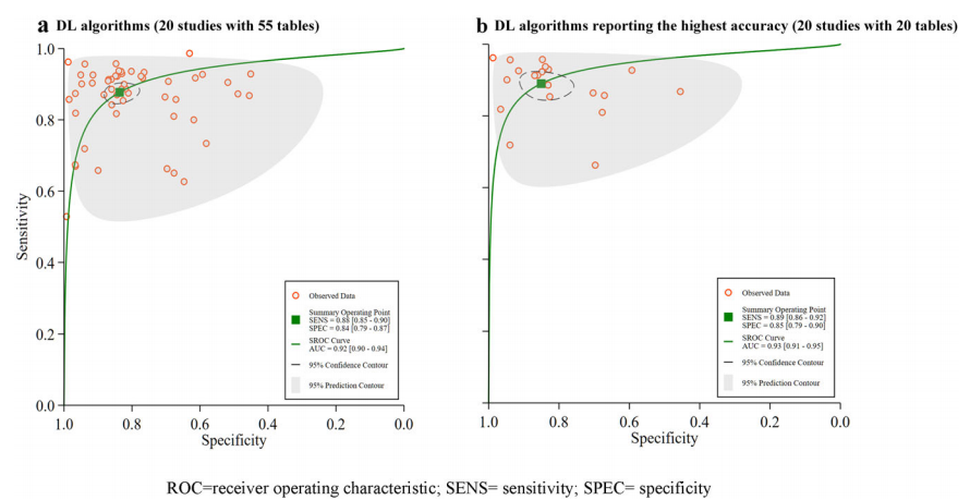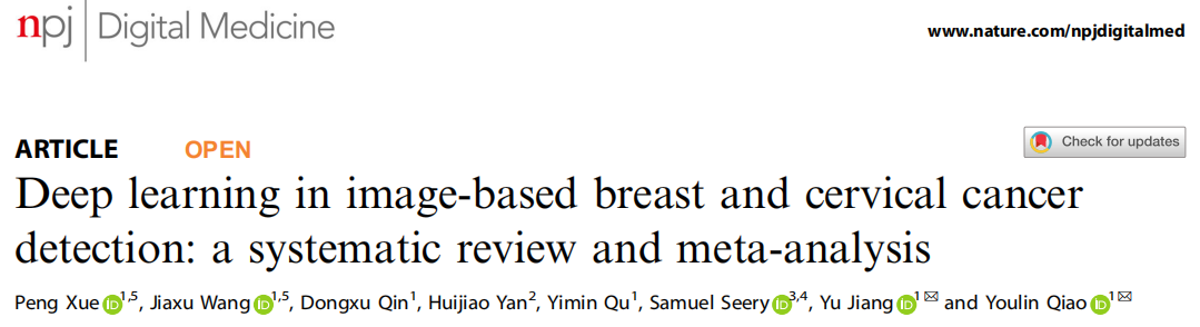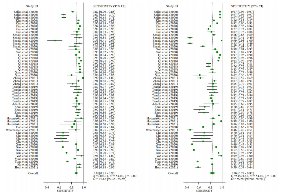 医学成像在肿瘤检测中起着至关重要的作用,尤其是在逐步数字化的癌症护理服务中。深度学习(DL)作为人工智能(AI)的一个子集,可以应用于医学成像,并在自动检测方面显示出良好的前景。美国食品和药物管理局(FDA)已经批准了一些基于DL的诊断工具用于临床实践,进一步的批判性评估和独立质量评估仍在等待中。 近日,来自中国北京和英国的一个研究团队在nature子刊npj Digital Medicine上发表了一篇题为“Deep learning in image-based breast and cervical cancer detection: a systematic review and meta-analysis”的文章,在文章中,研究团队进行了meta分析,以评估深度学习(DL)算法在早期乳腺癌和宫颈癌识别中的诊断性能。研究团队对20项研究进行了meta分析,综合敏感性为88%(95%可信区间85-90%),特异性为84%(79-87%),AUC为0.92(0.90-0.94)。因此,DL算法可用于使用医学成像检测乳腺癌和宫颈癌,其性能与人类临床医生相当。然而,由于研究设计和报告有瑕疵,这可能会导至偏见和高估算法性能。研究团队提出了几点提高DL研究质量的急需解决的问题,包括需要围绕研究方法和报告制定循证标准化指南,并强调了在实际临床环境中对DL性能进行严格可靠评估的必要性,以及DL算法的可推广性。 图片来源:npj Digital Medicine 主要内容 ✦ 研究选择和特点 ✦ 研究团队根据预定的纳入标准纳入了35篇研究进行分析。其中25篇关注乳腺癌,10篇关注宫颈癌。其中33项研究使用了回顾性数据。只有两项研究使用了前瞻性数据。两项研究也使用了来自开放获取来源的数据。8项研究排除了低质量的图像,而27项研究没有报告任何与图像质量有关的内容。11项研究使用样本外数据集进行外部验证,而其他研究使用样本内数据集进行内部验证。12项研究将DL算法与使用相同数据集的人类临床医生进行了比较。此外,医学影像学检查分为细胞学检查(n=4)、阴道镜检查(n=4)、宫颈造影(n=1)、显微内窥镜检查(n=1)、乳房X线检查(n=12)、超声检查(n=11)和MRI检查(n=2)。 ✦ DL算法的混合性能 ✦ 在该样本中的35项研究中,有20项提供了足够的数据来创建用于计算诊断性能的列联表,因此被纳入meta分析阶段的综合。当对所有研究进行平均时,所有DL算法的合并敏感性和特异性分别为88%(95%可信区间85-90)和84%(95%可信区间79-87),AUC为0.92(95%可信区间0.90-0.94)。大多数研究使用不止一种DL算法来报告诊断性能,因此我们在20个列联表中报告了不同DL算法对纳入研究的最高准确性。合并的敏感性和特异性分别为89%(86-92%)和85%(79-90%),AUC为0.93(0.91-0.95)。 DL算法的综合性能。图片来源:npj Digital Medicine ✦ 异质性分析 ✦ 所有纳入的研究都发现,DL算法在使用医学成像检测乳腺癌和宫颈癌时,与作为金标准的组织病理学分析相比是有用的;然而,观察到了极端的异质性。敏感性(SE)的I2=97.65%,而特异性(SP)的I2=99.90(p<0.0001)。 为了确定这种极端异质性的来源,研究团队进行了亚组分析,亚组分析结果显示异质性并没有与特定亚组一致,也没有降低到可接受的水平,所有亚组的I2值仍然很高。因此,研究团队可以推断不同的验证类型、癌症类型和成像方式是否可能影响DL算法检测乳腺癌和宫颈癌的性能。 使用forest plot对总体性能进行汇总估计。 图片来源:npj Digital Medicine ✦ 质量评估 ✦ 使用QUADAS-2对纳入研究的质量进行了评估。对于患者选择领域的偏倚风险,由于未报告纳入标准或排除标准,以及不适当的排除,有13项研究被认为存在较高或不明确的偏倚风险。对于index test 领域,只有一项研究由于没有预先确定的阈值而被认为具有较高或不明确的偏倚风险,而其他研究则被认为具有较低的偏倚风险。 对于参考标准领域,由于参考标准不一致,三项研究被认为存在较高或不明确的偏差风险。没有提及是否提前确定了阈值,以及是否实施了盲法。在适用性关注领域,12项研究被认为在患者选择方面具有较高或不明确的适用性。一项研究在参考标准领域的适用性也不明确,在index test领域没有适用性问题。 ✦ Meta分析总结 ✦ 这篇系统综述和meta分析表明,深度学习算法可用于利用医学成像检测乳腺癌和宫颈癌。证据还表明,虽然与临床医生相比,深度学习算法并不优越,但在性能上也不差。在乳腺癌和宫颈癌中观察到类似的深度学习算法具有可接受的诊断性能,尽管使用不同的成像方式有不同的工作流程。这一发现还表明,这些算法可以应用于乳腺或宫颈成像,并可能应用于利用成像技术早期识别病例的所有类型的癌症。 ✦ 深度学习在癌症诊断中的问题 ✦ 01 需要更多前瞻性研究 正如我们所见,纳入的研究大多是回顾性的,在方法和报告方面存在很大差异。需要更多高质量的研究,如前瞻性研究和临床试验,以加强现有的证据基础。大多数纳入研究都是回顾性研究,这可能是因为DL算法在医学成像中相对较新。然而,使用的数据源要么来自现有的电子病历,要么来自在线开放存取数据库,这些数据库并没有明确用于实际临床环境中的算法分析。如果可能的话,我们应该通过更多的前瞻性研究来调查乳腺或宫颈图像的潜在规律,并确定可能的图像特征相关性和风险预测的诊断逻辑。大多数研究使用小的标记乳腺或宫颈图像构建和训练算法,标签很少由临床专家进行质量检查。该设计故障可能会产生模糊的基本事实输入,这可能会导至意外的不利模型影响。当然,连锁反应是,由于不明的偏