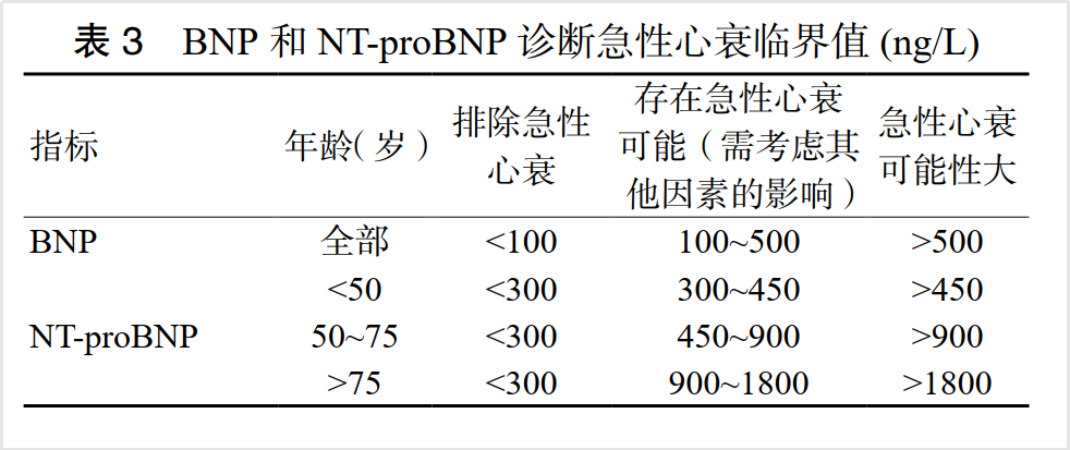 利钠肽作为心脏功能标志物,在心力衰竭预测、诊断/排除诊断、危险分层、治疗决策、评价治疗效果、预后判断等方面具有重要价值;在急性胸痛的危重度评估、危险分层和预后判断等方面也具有重要作用,二者诊断急性心衰的临界值如下表。