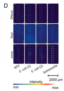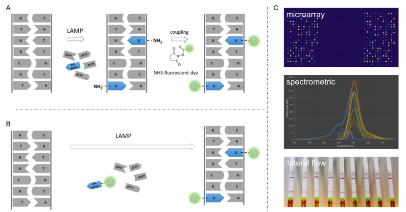 环介导等温扩增(LAMP)是最著名和最流行的等温扩增方法之一。它的简单性和速度使该方法特别适合于护理点诊断。然而,假阳性结果仍然是一个主要缺点。许多(下游)应用用于检测LAMP扩增子,如比色分析、原位LAMP或CRISPR Cas系统。通常,对于不同的检测应用,如横向流动分析,需要对LAMP产品进行修改。这通常是通过事先修饰引物实现的。 近日,来自德国的研究团队在Scientific reports上发表了一篇题为“Investigation and validation of labelling loop mediated isothermal amplification (LAMP) products with different nucleotide modifications for various downstream analysis”的文章,研究的目的是评估不同修饰核苷酸(如Cy5-dUTP、生物素-dUTP和aminoallyl-dUTP)的扩增子标记作为预标记引物的替代方案。研究团队研究了分子大小、核苷酸量以及靶浓度对扩增和标记效率的影响。这项研究表明,在LAMP过程中,使用不同的修饰核苷酸可以实现LAMP扩增子的不同标记,并且这些样品可以通过荧光光谱、凝胶电泳、微阵列和横向流动系统等广泛的下游应用进行分析。此外,研究团队还证明了基于微阵列的检测以及识别和区分假阳性的能力。 图片来源:Scientific reports LAMP背景及优劣势 2000年,Notomi等人开发了一种新的等温扩增技术,名为环介导等温扩增(LAMP)。二十多年后,LAMP属于最流行的等温放大技术。该方法基于一组多达6个引物和一个链置换聚合酶,能够高度敏感和特异地扩增少量目标DNA。结合逆转录酶,它也适用于RNA扩增(RT-LAMP)。到目前为止,在RT-LAMP、RIME-LAMP或DARQ-LAMP等多个变体版本中,可以找到超过千份使用该技术的出版物。自2019冠状病毒疾病大流行开始以来,已经发表了800多篇关于SARS-CoV-2检测的出版物。其中,大约有100个是用LAMP作为检测方法的。这不仅强调了LAMP对一般研究的重要性,也强调了它对当前全球重要问题的重要性。 与基于PCR的非等温方法相比,使用LAMP进行核酸扩增和检测具有许多优势。首先是放大速度。通过使用合适的引物组和最佳扩增条件,可以在不到30分钟的时间内检测到少量目标核酸,而PCR过程的扩增时间最多为3小时。此外,由于对能源和技术设备的需求减少,护理点设备中集成和使用LAMP是非常方便的。尽管LAMP有许多优点,但由于污染、序列相似性和引物二聚体引起的扩增假阳性是众所周知的LAMP缺点。 LAMP扩增产物的检测方法 LAMP与下游分析系统结合检测扩增产物的方法很广泛。包括标准凝胶电泳和定量扩增LAMP(qLAMP),通过不同的比色试剂(酚红、无色结晶紫、SYBR绿、孔雀石绿)进行横向流动分析(LFA)或与CRISPR-Cas系统的组合。最常用的是LFA和比色分析,但上述技术的主要局限性在于,它们不适合区分假阳性结果。基于微阵列的检测方法有助于克服这一障碍。 长度约为20–30 nt的特异性单链DNA探针固定在修饰表面上。扩增后,产物可以在这些探针上进行高度特异性杂交。通过选择合适的探针,不仅可以将扩增子与假阳性区分开来,甚至可以将其与单核苷酸多态性(SNPs)区分开来。 使用(半)定量分析系统(如qLAMP)和基于横向流动的方法需要标记用于目标检测的扩增子。到目前为止,使用预先标记的引物或探针一直是首选方法。这也导至了低灵活性和高成本、信号强度或放大效率调整不灵活性。或者,可以在扩增过程中使用预先标记的核苷酸进行靶向标记。这些类型的核苷酸具有不同的修饰,例如荧光团、生物素或氨基功能化,用于随后的定制标记。 灵活的LAMP标记方法 本研究旨在分析和评估所述基于直接和灵活的LAMP标记方法。此外,还证明了用3-Cy5-dUTP、生物素-dUTP和AA-dUTP标记LAMP扩增子的优缺点,代表了小、中、大尺寸的核苷酸修饰。 上述核苷酸修饰不仅具有不同的分子大小,而且在不同的分析和检测系统中也有用。Cy5-dUTP可用于用荧光团直接标记扩增子,用于多种荧光检测方法,结合生物素dUTP可在常用LFA中的链霉亲和素修饰表面上实现非共价固定。AA dUTP被认为允许加入一个功能基团,这可能有助于后续NHS分子的标记。 LAMP-dUTP标签策略及应用。 图片来源:Scientific reports x-dUTP掺入对LAMP效率的影响 为了确定在LAMP期间使用标记核苷酸对扩增效率的影响,使用不同量的SARS-CoV-2 cDNA和Cy5-dUTP以及生物素-dUTP和AA-dUTP稀释系列进行了基于SYBR绿色的定量环介导等温扩增(qLAMP)。每个反应的cDNA量为4.2E+00ng,Cy5-dUTP浓度范围为4.0E-03mM到2.0E-01mM,在不到5分钟的时间内检测到目标DNA。使用该量的靶DNA的反应效率只有轻微差异。然而,当使用较低数量的靶DNA时,已观察到扩增效率降低。 标记核苷酸对扩增效率的影响。 图片来源:Scientific reports 与未标记的核苷酸相比,Cy5-dUTP是一个相对较大的分子,因此研究团队研究了使用不同分子大小的各种dUTP标签对扩增效率的影响。对于AA-dUTP(589.2 g/mol)、生物素-dUTP(862.7 g/mol)和Cy5-dUTP(1387.3 g/mol),在以分子量表示的分子大小和所需的扩增时间之间发现了明显的相关性。未标记的参考样品的Ct值为15.6分钟。使用生物素dUTP和AA dUTP标记也会导至Ct值小于16.5分钟。使用Cy5 dUTP对扩增时间的影响最大,Ct值偏移为3.5分钟。 分子大小和浓度的影响。图片来源:Scientific reports Cy5-dUTP掺入和分析 通过Cy5-dUTP直接标记和AA-dUTP间接标记以及随后的NHS-Cy5标记,计算Cy5掺入LAMP扩增子的速率。LAMP扩增产物通过荧光光谱分析,记录在630nm激发下600 nm至800 nm范围内的发射光谱(图4A)。所有样品(Cy5稀释系