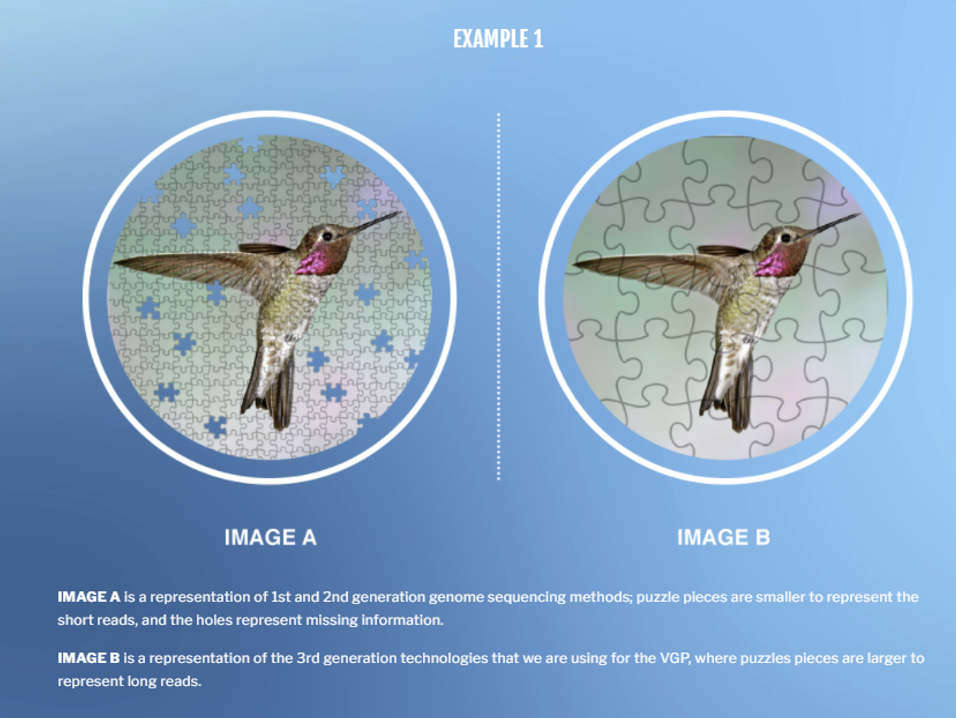 相比于二代基因测序使用「光信号」作为信号媒介(根据 dNTP 在反应中产生的荧光波长不同,由 PTP 板另一侧的 CCD 照相机记录,通过光学信号处理而获得最终的测序结果),以 ONT 为代表的纳米孔技术,则让三代基因测序进化到了「电信号」阶段。ONT 设计了一种特殊的生物纳米孔,当 DNA 碱基通过纳米孔时,孔中的电阻发生变化,影响流过纳米孔的瞬间电流强度。由于每种碱基引起的电流影响不同,因此使用特殊设备分析微电流变化,即可鉴定通过的碱基对。由于读长更长,三代基因测序在基因组拼接上比二代测序更「容易」了。基因测序的一个主要应用是拼接物种的基因组(如人类基因组计划)。物种的 DNA 需要先经过打断处理,然后通过一系列的实验过程才能在测序仪上运行,最终得到测序数据。测序技术的不断进步就是一个将基因组拼接得更完整、更清晰的过程。如果将基因组的拼接比喻成拼拼图的游戏,对于同样的一张图片来说,如果二代测序的拼图中有 10000 块碎片,那么三代测序的拼图可能只有 100 块碎片(三代测序的读长是二代测序的百倍以上)。显而易见,100 块碎片的拼图难度大大降低了。最明显的例子来自世界著名的生物科技研究中心英国 Sanger Institute 发起的「脊椎动物基因组计划」(Vertebrate Genomes Project)官网上对于二代测序和三代测序的比较。