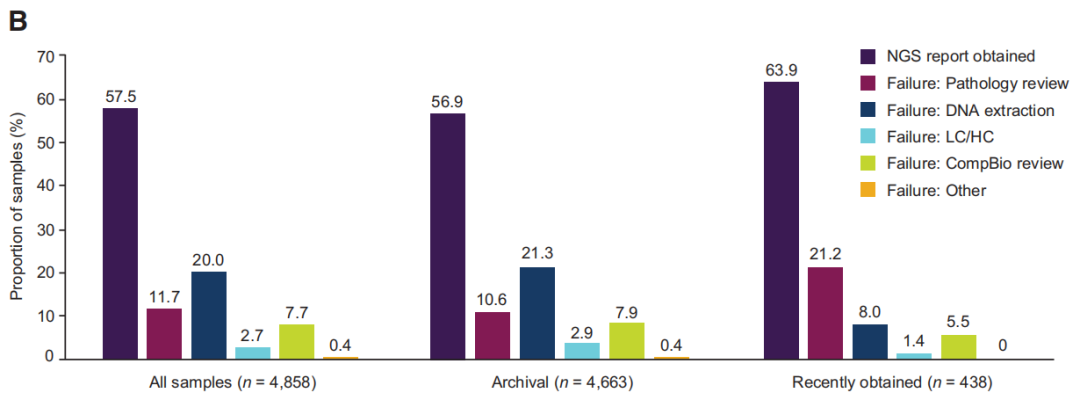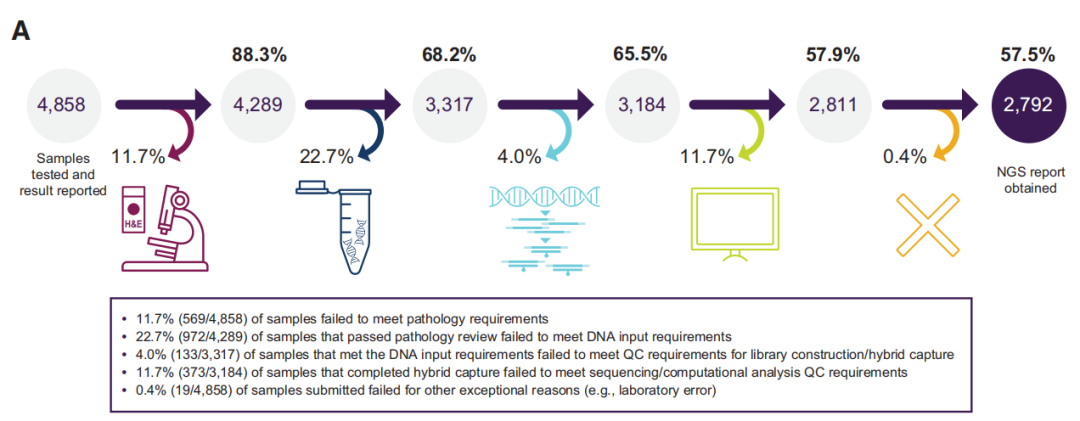 前列腺癌是一种常见而复杂的恶性肿瘤,严重威胁男性健康。全球范围内,前列腺癌占男性肿瘤年新发病例第二位,死亡原因第五位。初诊的前列腺癌大多对雄激素剥夺治疗(ADT)敏感,但随着病程进展,几乎都会进入预后较差的去势抵抗性前列腺癌(CRPC)阶段,尤其是转移性去势抵抗前列腺癌(mCRPC)。同源重组修复(HRR)是DNA双链断裂的重要修复途径,HRR相关基因突变会导至基因不稳定并促进肿瘤生长。研究显示,在mCRPC患者中,HRR基因突变大约占到20%-30%。既往研究提示PARP抑制剂在HRR突变的mCRPC中显示了抗肿瘤活性与安全性。 PROfound研究是第一个在前列腺癌领域利用分子分型指导靶向治疗的阳性结果Ⅲ期临床研究,不仅为PARP抑制剂在前列腺癌的治疗提供了有力的临床证据,也为前列腺癌的基因检测方法进行了全面的探索。尽管肿瘤组织样本是分子检测的金标准,但在临床诊疗中因为样本质控问题难以常规开展检测。临床上适合NGS分析的样本类型优选新鲜组织标本,也可选用FFPE样本、肿瘤细胞学样本及血浆(游离DNA/RNA)等。对于新鲜组织,可采用冷冻切片染色评估样本中的肿瘤细胞含量,对于FFPE样本,制作石蜡切片时,切取5片连续切片,其中1片进行HE染色评估肿瘤细胞的含量。除了样本组织类型,其他因素也会影响NGS结果。2022年发表在Clincal Cancer Research(IF:12.531)的一篇文章报道了PROfound研究中4000多名接受筛选的mCRPC患者肿瘤组织样本基因检测情况,讨论了真实世界中分子检测所面临的困局。 研究方法 研究纳入携带1-15个HRR基因突变、既往经二代抗雄激素药物(恩扎卢胺、阿比特龙)治疗进展的mCRPC患者。根据基因突变类型不同,分为两个队列。队列A患者至少携带BRCA1、BRCA2或ATM基因突变其中之一,队列B至少携带其他12个基因突变(BRIP1、BARD1、CDK12、CHEK1、CHEK2、FANCL、PALB2、PPP2R2A、RAD51B、RAD51C、RAD51D、RAD54L)其中之一。 研究结果 总结 PROfoud研究表明,基因检测来识别HRR基因突变是可行的。送检的样本会经过病理评估、DNA质量评估、测序质量评估等严格的质控步骤,每一步都会有一部分样本因质控不合格而无法获得NGS结果。样本储存年限、肿瘤纯度和DNA产量是影响NGS结果的三大要素。如果有多个样本,当这些样本的肿瘤纯度相近时,则考虑选择较新鲜的样本。对于储存年限超过5年的样本,则考虑使用肿瘤纯度最高的样本,或者样本来源为淋巴结等肿瘤细胞含量较高的组织。对于新收集的样本,使用福尔马林固定和避免脱钙处理(对于骨组织样本)有助于保持核酸的完整性。高质量的肿瘤组织样本是获得NGS结果和筛选可能从奥拉帕利治疗中获益的mCRPC患者的关键。 裕策生物NGS检测质控流程 目前NGS检测的样本来源主要为组织、细胞、体液,收集的样本需经过前处理、核酸提取、核酸质控、文库构建、文库测序、数据分析等步骤。裕策生物旗下深圳裕康医学检验实验室(以下简称:裕康医学实验室)有着严格的质控标准,曾在多次室间质评中获得国际认可。 近日,裕康医学实验室病理图像判读水平获得CAP认可,为患者提供准确客观的病理诊断结果,从而使更多肿瘤患者能够获益,为精准诊疗保驾护航。 裕策生物NGS检测流程 CAP NEO-A 2022成绩单 |