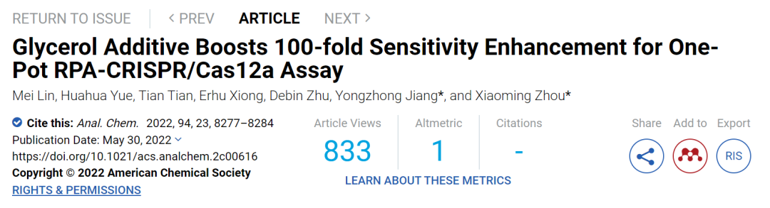 该团队发明了一种甘油添加剂增强的单管 CRISPR 核酸检测方法。该研究于2022年5月30日发表于 Analytical Chemistry 期刊,论文题为:Glycerol Additive Boosts 100-fold Sensitivity Enhancement for One-Pot RPA-CRISPR/Cas12a Assay。