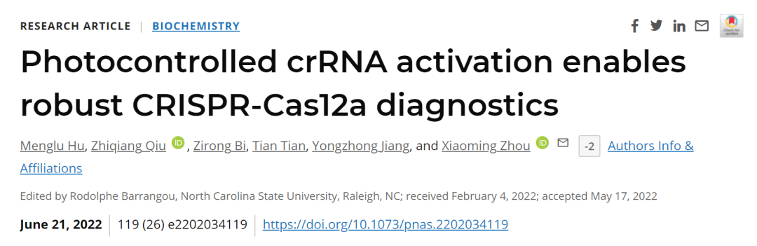 该团队还发明了一种光控 CRISPR 检测技术。该研究于2022年6月21日发表于《美国国家科学院院刊》(PNAS)上,论文题为:Photocontrolled crRNA activation enables robust CRISPR-Cas12a diagnostics。