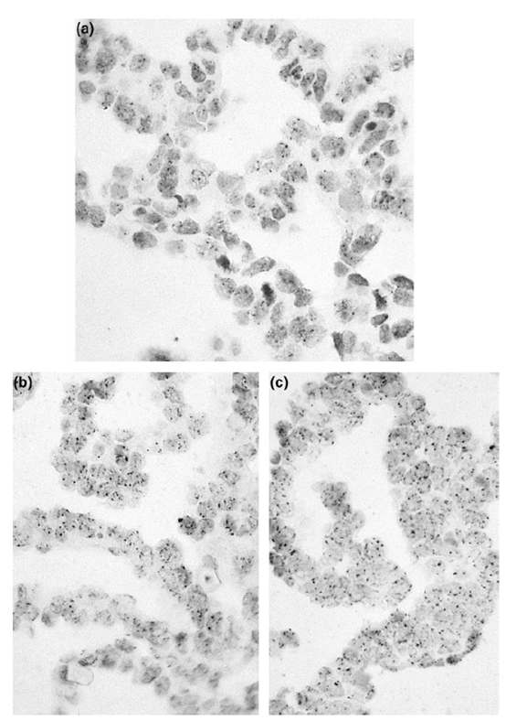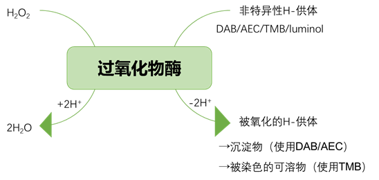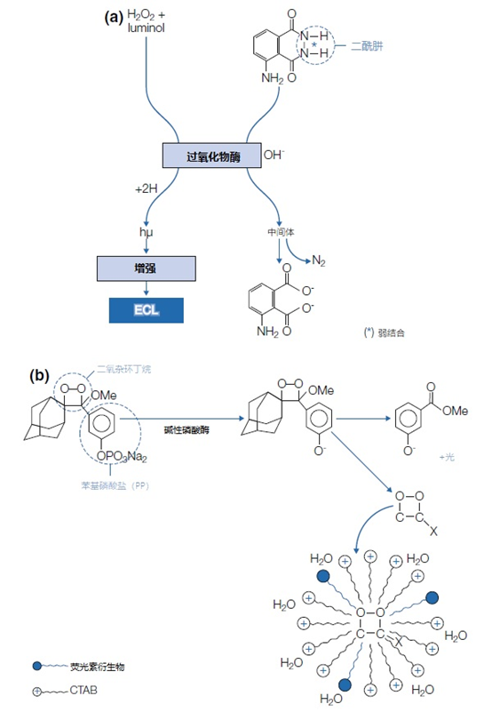 3、标签的检测 荧光色素(其中包括FITC、TRITC、AMCA、Cy3、Cy5、JOE™、FAM™、HEX™、TAMRA™和VIC™)被广泛作为标签使用(见表1)。这些标签可以直接使用荧光显微镜或PCR设备或测序仪中敏感的CCD照相机进行检测。 表1 | 常用的氟色素。荧光色素可以连接到核苷酸三磷酸酯的寡核苷酸上,如UTP、ATP、CTP,或用于qPCR、测序(SEQ)、核酸的定量和熔解曲线分析(MCA),或用作猝灭剂 FRET:福斯特共振能量转移 ISH:原位杂交 (*)当猝灭是结果时,发射波长不相关 (#) U(尿嘧啶)也可以被其他氮基取代,例如 「A」 FITC、TRITC和AMCA主要用于荧光原位杂交(FISH),特别是用于细胞或组织样品(组织学样品、细胞孢子、或细胞涂片、拭子)或临床样品微生物培养后的样品,以检测病原体。 在病理学和遗传学中,染色体异常可以用染色体特异性探针进行诊断。正确的抗褪色剂可以防止荧光信号的褪色。探针的性质强烈地决定了识别基因片段和完整染色体的分辨率(图9)。 图9 | 染色体的杂交 用四种不同类型的荧光探针对染色体进行杂交;每一种探针都有不同的分辨率,应用于蜕膜期(左栏)和界面期(右栏)的细胞中。探针越大,图像越发扩散。 来源 不可追踪。 a 带有「染色体绘画」的总探针:探针来源于一个完整的染色体库,在完整的染色体上杂交。探针被分割成碎片以促进扩散。这将在缺口翻译或随机引物中自动发生。 b 中心粒探针:一个合成的寡核探针可以识别中心粒上的重复序列((ACAAACT/ACAAATT)n)。中心粒探针可用于识别染色体数量的差异。 c 基因特异性探针是由特定的寡核苷酸或PCR或质粒探针(通常是随机引物或缺口翻译)组成的混合物。值得注意的是,这种探针只识别特定基因的独特序列。 d 某些染色体的三体化可以通过使用特异性探针进行观察 Cy3和Cy5主要用于微阵列和DNA芯片,Cy5也作为水解探针的标签。JOE™、FAM™、HEX™、™ VIC™和许多其他标签在实时PCR中以不同的组合使用。 4、触变剂 触变剂经常被用作引物和探针的标签。知名的触变剂是氟色素(FITC)、地高辛、溴脱氧尿苷和生物素。除了氟染色剂,标签不提供可检测的信号。为了使其可视化,需要有报告基团(见图2)。酶(过氧化物酶、碱性磷酸酶、ß-半乳糖苷酶)、胶体金颗粒和氟色素都是报告基团的例子。每种报告基团类型都可以通过适当的技术进行可视化。 中间试剂如合子特异性抗体将报告基团与合子现场耦合/结合在一起(图4(3a))。由于抗体的特异性只基于分子的抗原结合部分(Fab;Fragment抗原结合),而不是分子的其他区域,这允许后续的检测反应,基于共同的分子。这主要是在分子的Fc部分(Fragment crystallizable)(见图4(3))。这可以是Fc特异性的,报道标记的第二抗体或Fc-检测蛋白A或G(图4(3))。通常使用一个合子/标签系统。 链霉亲和素-生物素介导的检测:生物素标签可以被检测,不仅可以用生物素引导的抗体,还可以有效地用微生物肽;链霉亲和素(图4(3b,4)和图3)。报告基团如酶或荧光色素可以与链霉亲和素偶联。链霉蛋白-生物素检测被广泛使用,既可用于直接杂交,也可与几种PCR策略相结合,如PCR-ELISA(见图10)。 图10 | PCR-ELISA 用生物素化引物和生物素-dUTP进行常规PCR后,样品被稀释1/20,并在涂有链霉亲和素的96或384孔ELISA板中孵化。扩增物通过链霉亲和素-生物素的相互作用被捕获,之后进行几个洗涤步骤。通过经典的TMB/H2O2-酶反应,使用带有过氧化物酶报道的特异性抗体来检测荧光铬标记的扩增物。 一种更便宜的替代检测,只需要一个生物素标记的引物,通过链霉菌素建立检测。链霉亲和素被固定在平板上,然后进行变性,只有一个氟铬标记的扩增物特异性探针与(生物素化的)单链扩增物杂交。 一个链霉菌素分子有四个生物素的结合点。其中一个需要与生物素化的扩增物或杂交的生物素化的探针进行高亲和力反应。三个生物素结合位点用于与生物素/报道复合物结合。这样,许多生物素化的酶分子或其他报告基团可以通过链霉菌素叠加到一个生物素标签上。荧光染色体与生物素以严格的比例耦合到可以通过生物素与链霉菌素结合的载体(例如BSA)上。使用提拉米特放大法可以进一步增加信号(见图11)。 图11 | 碱性磷酸酶检测(不溶性产物) 碱性磷酸酶催化NBT/BCIP的磷酸化。自发的氧化还原反应后形成不溶性沉淀物。NBT(硝基蓝色氯化四氮唑)是一个质子受体,将在红色的福马赞中转移,而BCIP(5-溴-4-氯-3′-吲哚磷酸对甲苯胺盐)将被解磷化,并在蓝色的不溶性物质(5,5′-二溴-4,4′-二氯化靛)中还原。两种参与的结果都是紫色的参与。这种技术经常用于膜上或原位杂交。 5、报告基团 报告基团直接(荧光色素)或间接(酶、胶体金)提供荧光或吸光信号,用于识别杂交探针(见图2)。当应用荧光色素作为报告基团时,可以通过荧光显微镜或CCD荧光测量仪同时检测(直接检测)。PCR广泛使用荧光色素,尽管有些平台使用间接检测。 当报告基团本身不产生信号而需要额外的步骤进行可视化时,就需要间接检测。目前,酶是最广泛使用的。结合与固相(尼龙膜、细胞、组织)的杂交,它们会产生一个沉淀物。在某些情况下,需要一个可溶性的产品,如ELISA格式。酶总是需要一个可溶性底物来转化为可检测的产物。 过氧化物酶使用过氧化物(H2O2)作为底物,与非特异性质子供体结合(图12)。 TMB = 溶剂的质子供体(黄色)。 DAB = 细胞、组织和膜中反应的质子供体
