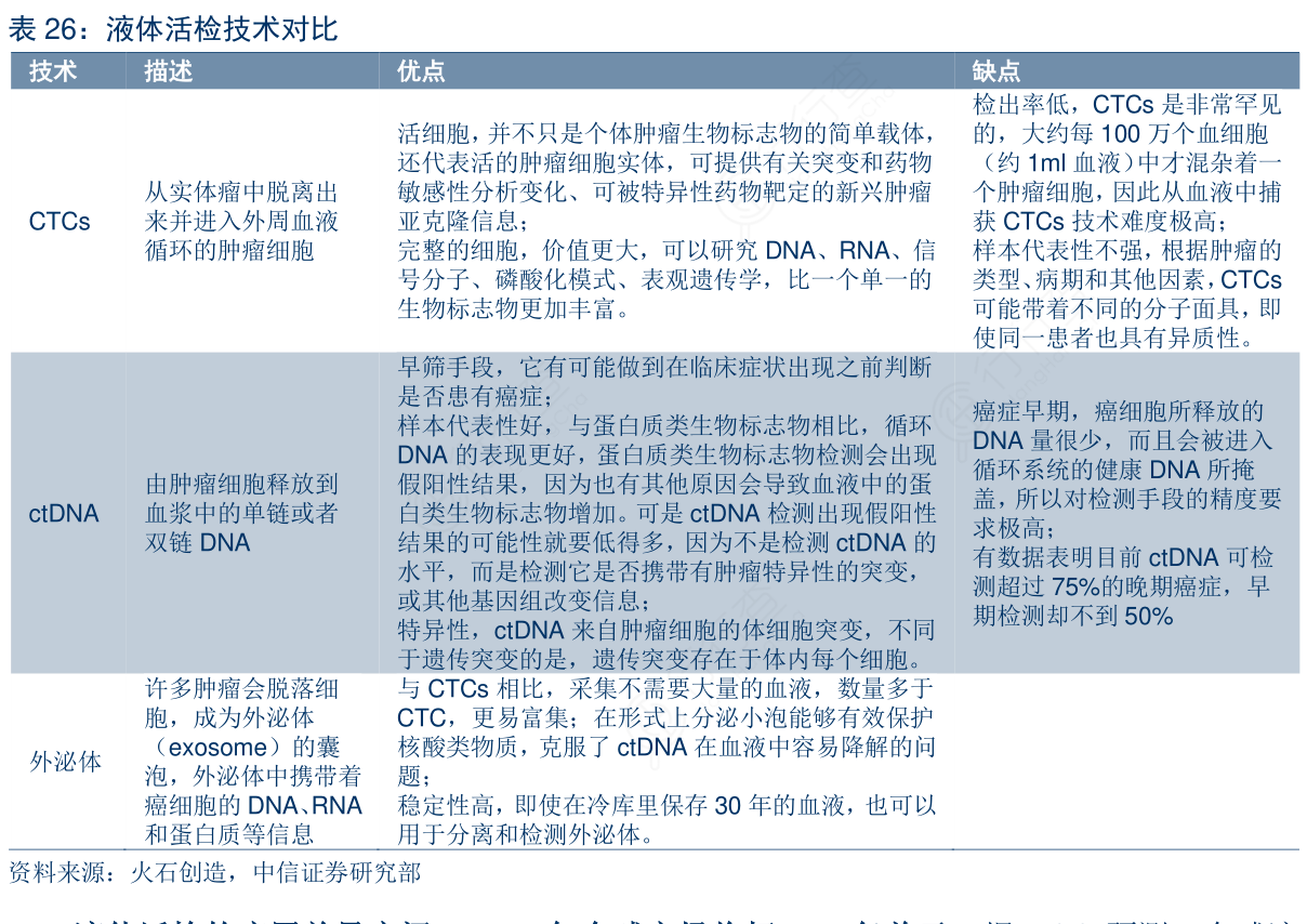 液体活检是一种通过体液(主要是血液)对疾病进行筛查或诊断的技术,在肿瘤精准医疗方面拥有巨大潜力。相比传统的穿刺活检,液体活检拥有取样简便、创伤小、痛苦低的特点。目前液体活检所探测的外周血肿瘤信息包括循环肿瘤细胞(Circulating Tumor Cell,CTC)、循环肿瘤DNA(Circulating Tumor DNA,ctDNA)和外泌体(Exosomes)等。液体活检(尤其是CTC)的技术难点在于血液中目标含量低,难以富集。目前市场上对CTC技术和ctDNA技术的研究相对较多, CTC技术起步较早,临床研究也较为丰富,但由于技术难度高、检出率低、异质性强等特点限制了该技术的发展。相比CTC,ctDNA的捕获相对容易,检测手段也更成熟,并且ctDNA在检测驱动基因突变方面具有得天独厚的优势,从而越来越多的应用于癌症早筛和伴随诊断,ctDNA现已成为市场中最常用的液体活检技术。液体活检的主要应用方向是肿瘤领域的伴随诊断、病情监测、早期筛查。其中ctDNA对突变的检测敏感性更高,适宜用于伴随诊断指导用药。而CTC的数量则与肿瘤状态有较高相关性,有望在病情监测等方面有更好表现。