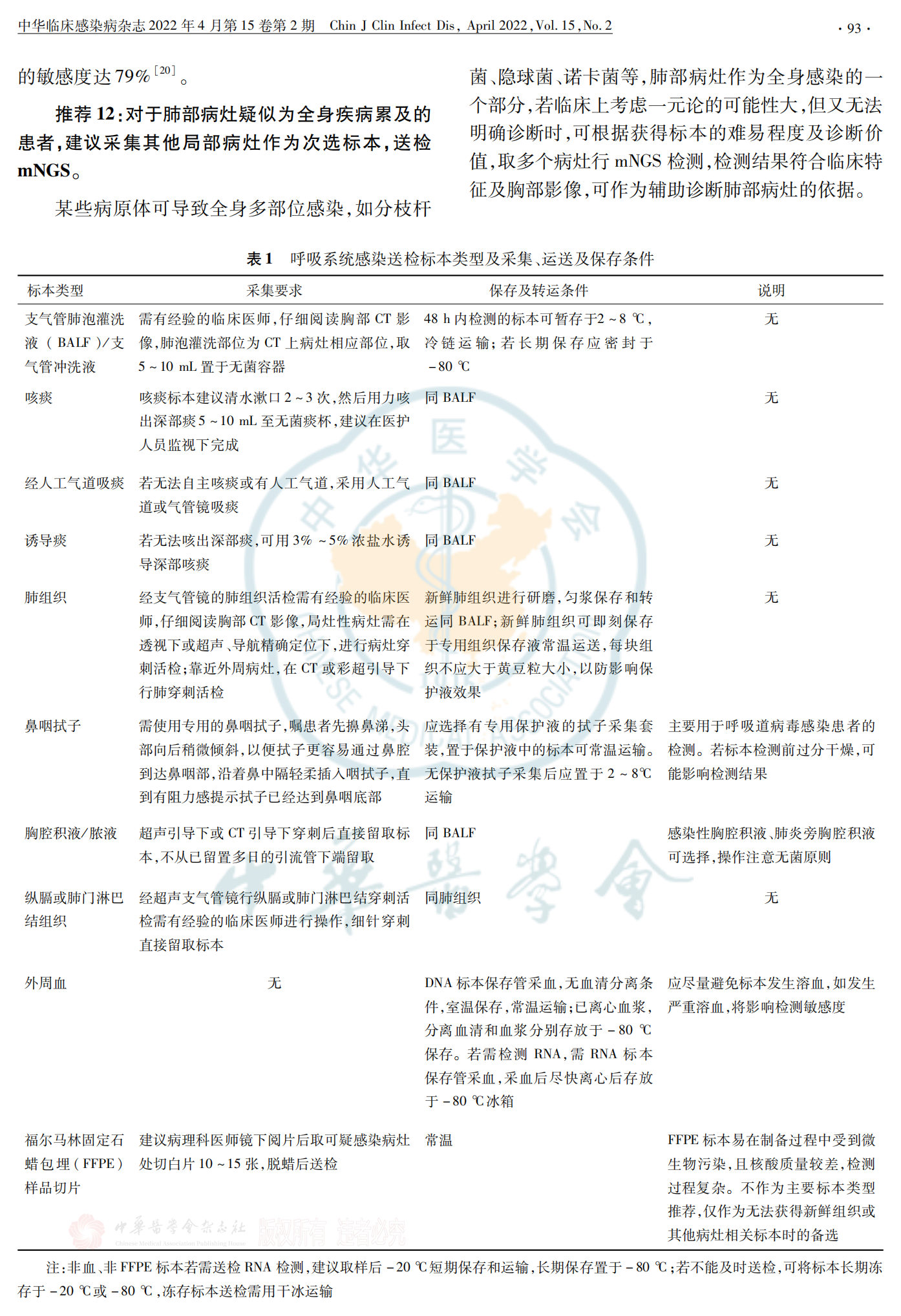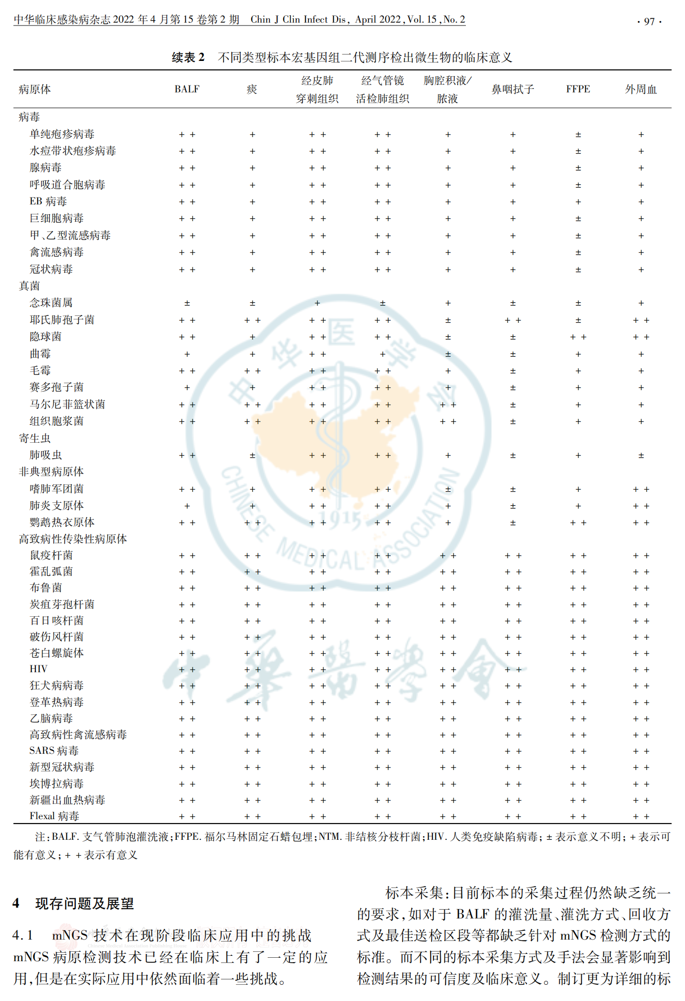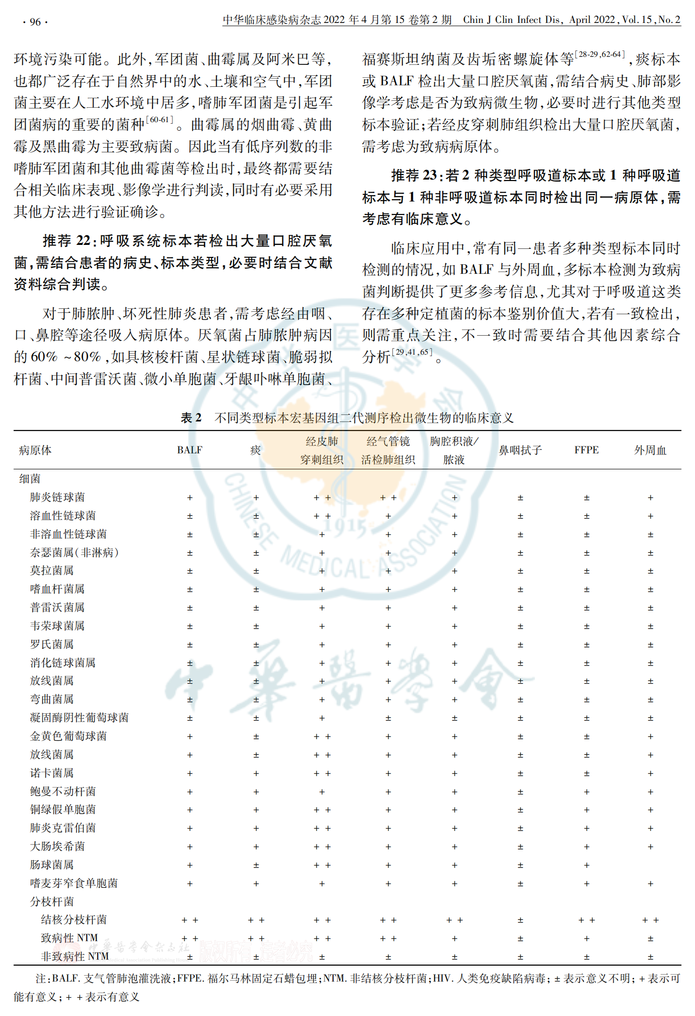 快速、准确的病原学诊断,能尽早选择敏感的抗感染药物或采取有效、具有针对性的防控措施,是感染性疾病精准化防治的核心。宏基因二代测序作为一种新兴的检测技术,能够不依赖微生物培养而检出临床样本中的所有微生物,该技术已在国内被广泛应用,并展现了其快速、无偏倚和高检出的优势。宏基因组二代测序(mNGS)已被广泛应用于感染性疾病的病原检测。然而,呼吸系统感染具有特殊性:病原组成复杂、标本类型选择多样、存在感染与定植、不同标本类型结果解读原则不尽相同等。为规范临床送检适应证,选择合适的送检标本以及恰当地解读报告,特组织专家对上述问题进行讨论并撰写专家共识,以期为呼吸系统感染中mNGS技术临床应用及报告解读提供专业的指导和帮助。【关键词】 呼吸系统感染;宏基因组二代测序;结果解读;专家共识呼吸系统感染是造成全球死亡人数最多的一类感染。2019年世界疾病负担研究学会的数据显示,下呼吸道感染(LRTIs)发病率和病死率在成人和儿童中位居第4位,2019年死亡人数达 260万。呼吸系统感染的病原体种类繁多,病原诊断困难,只有通过快速精准的病原体判断,并进行针对性的抗感染治疗,才能达到最佳的临床预后。虽然近年来分子生物学方法在感染性疾病病原检测中表现突出,但仍有50%左右的呼吸系统感染无法明确病原体。宏基因组二代测序(mNGS)通过对临床标本进行宏基因组测序,可以无偏向性地检出标本中的多种病原微生物(包括病毒、细菌、真菌和寄生虫),目前已被广泛应用于临床感染性疾病的病原检测,越来越多的临床研究及特殊病原体感染案例报道(特别是少见、苛养病原体)肯定了mNGS在感染性疾病辅助诊断中的价值,也不乏在呼吸系统感染中应用的研究。然而,目前临床送检适应证不明,检测质量参差不齐,报告解读也缺乏规范。不同于无菌腔隙,呼吸系统与外界相通,存在正常菌群,微生物组成尤为复杂,定植菌与感染菌的鉴别困难;不同呼吸系统感染类型优选标本类型也不同,不同的标本类型检测结果解读原则不尽相同,故呼吸系统mNGS临床应用及报告解读需要更专业的指导。目前我国已发表多个mNGS专家共识,但对临床上应用越来越广泛且结果解读难度较高的呼吸系统感染缺少专门介绍。为提高mNGS在呼吸系统感染病原诊断中的质量,规范临床送检适应证,选择合适的送检标本类型以及恰当解读报告,特邀请感染病学、呼吸病学、临床微生物学及医院感染管理等领域的专家共同编写制订此共识。此共识适用于上呼吸道感染(病毒感染等)、LRTIs(肺炎、肺脓肿、支气管扩张伴感染等)和胸腔感染。共识内容旨在为临床样品送检和解读提供参考,不作为临床诊断标准流程。以下送检推荐,建议在送检 mNGS的同时送检传统微生物检测。推荐 1:疑似 LRTIs的危重症患者,建议送检mNGS。由于现有常规微生物检测方法敏感度低、检测时间长及病原谱窄等因素的限制,LRTIs病原检出率低。重症 LRTIs患者若得不到及时有效治疗,病情可迅速进展,甚至危及生命。重症肺炎中 mNGS较传统方法病原检出率更高,可降低重症肺炎病死率。推荐 2:免疫功能抑制患者的呼吸系统感染,建议送检 mNGS。免疫抑制患者发生呼吸系统感染时,致病病原体较免疫正常患者更为复杂,且起病隐匿,进展快速,预后差,病死率高,故应特别重视,尽早明确病原学诊断。免疫抑制按机制主要分为粒细胞减少或功能障碍、体液免疫缺陷和细胞免疫缺陷三种类型,某些患者可能存在联合免疫抑制。在免疫抑制患者中,mNGS检测到的病原体更多,临床符合率高,能发现更多的真菌、病毒以及混合感染,如巨细胞病毒(CMV)合并耶氏肺孢子菌。推荐 3:疑似慢性肺部感染或难治性感染,且既往治疗效果不佳时,建议送检 mNGS。普通医疗机构对于慢性感染病原体及特殊病原体缺乏有效的检测手段。通常这类病原体检测耗时长、敏感度低或完全无法通过常规的培养及免疫学手段进行确诊。多个临床研究显示,mNGS在分枝杆菌[结核分枝杆菌(MTB)、非结核分枝杆菌(NTM)]、真菌(毛霉、曲霉)和厌氧菌等病原体检出优于传统培养。推荐 4:疑似呼吸道感染暴发且病原体不明,建议送检 mNGS。呼吸道感染暴发应采取准确、快速、全面的方法以尽快明确病原体,医院感染管理科、疾病预防控制中心等部门方可根据病原体采取有效的防控措施。对于新发病原体,mNGS具有传统培养及靶向分子诊断技术所不具备的优势。推荐 5:通过有创性操作获取的组织标本,如经皮肺穿刺组织、经支气管镜肺活检组织(TBLB)及经超声支气管镜淋巴结穿刺活检组织 (EBUS TBNA)等,建议送检 mNGS。经皮肺穿刺活检术、TBLB、EBUS TBNA需在CT、X线透视或超声引导下进行,能够直接取到病变组织。但是,标本采集操作难度高、标本重复采集可能性低,目前包括组织病理、肺组织涂片、培养及其他分子生物学检查均有各自的局限性。因此,送检 mNGS可提高病原诊断敏感度,通过不同检测方法组合,提高病原诊断率,尽早进行目标性治疗。推荐 6:怀疑厌氧菌引起的肺脓肿、坏死性肺炎或其他肺部感染,建议采集避免口腔菌群污染的标本(如下呼吸道标本、经皮穿刺肺活检组织及胸腔积液),送检 mNGS。厌氧菌培养需要绝对厌氧环境,且通常为合并感染,故常规培养阳性率低,由混合口腔厌氧菌所致慢性肺脓肿并不少见。多项研究发现,mNGS在厌氧菌诊