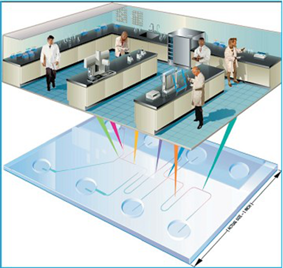 (一)微流控定义提到实验室,我们想到的都是实验室里琳琅满目的器材设备,繁复而严谨的操作方式,而微流控技术是在一个几平方厘米的芯片中依靠外力或芯片材料自身的毛细现象实现液体在微观尺度上的精确混合、反应和分离。其与传统生物化学分析、微阵列生物芯片分析之间的比较如下表所示: 图. 传统实验室转换为微流控芯片实验室的示意图[1]