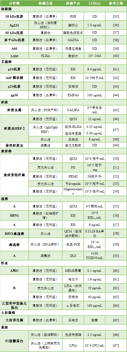 目前批准的许多寄生虫病的测试被认为受到特异性或灵敏度的限制,或对辅助部件和训练有素人员的要求。 特异性的问题正通过严格的方法来解决,以合理的抗体开发来检测特异性抗原。这种具有极高亲和力的抗体的开发会影响到检测的灵敏度。 然而,对灵敏度的最大贡献可能来自于检测平台和组件的改进,这也会影响到对集中式实验室检测的要求,因为在低资源环境下,没有受过训练的人员。 1、抗体 有几个因素会影响任何分析测试的质量。无论何种形式,测试的特异性是最重要的,在免疫测定领域,特异性取决于抗体和目标抗原之间的相互作用。图1中概述了产生特异性抗体的众多途径。 图1 | 抗体产生途径概述。从确定目标生物标志物开始,概述了为诊断性检测开发优越的生物识别元素的关键步骤。 多克隆试剂的使用因其产生的广泛特异性、对大量实验动物的要求和批次间的差异而受到影响。单克隆抗体的产生是产生特异性抗体的一种途径,与多克隆抗体的广泛覆盖面相比,它的灵敏度降低。传统上,由于亲和力上限的概念,这种试剂表现出低纳摩尔的亲和力[1]。 这些限制可以通过重组抗体技术来解决,该技术允许通过一些展示技术开发出亲和力极高的特异性试剂[2]。再加上先进的重制方法,这些重组抗体对诊断应用具有相当重要的意义。预计在不久的将来,基于重组抗体的诊断测试的发展将凸显出来。为了解决交叉反应问题,基于详细目标评估的知识驱动的方法可以最小化,或者如果需要的话最大化目标交叉反应。 使用替代宿主来产生抗体,如鸡,也可以帮助减少由于补体元素和人类抗小鼠抗体(HAMA)交联造成的假阳性[3]。因此,产生的试剂的质量将对所设计的检测方法的灵敏度和特异性产生重大影响。样品基质及其制备与应用的信号检测方法相结合,将对灵敏度产生巨大的影响,表1中概述的几种方法显示了改善传染病检测的复杂方法。 表1 | 正在研究中的用于检测传染病的检测方法 [a] ND,未确定;CV,循环伏安法;DLS,动态光散射法;EID50,50%鸡蛋感染剂量;EIS,电化学阻抗光谱法;EMPAS,电磁压电声学传感器;FO,光纤;LFIA,侧向流动免疫测定法;MAPIA,多抗原打印免疫测定法。MEMS,微机电系统;NALIFA,核酸LIFA;PEMC,压电激发的 mM级悬臂;QCM,石英晶体微天平;RIfS,反射干扰光谱;SPEC,丝网印刷碳电极;TCID50,组织培养感染剂量中值。 2、微流控技术和纳米技术及其与传染病检测的关系 微流控方法是解决目前RDT局限性的有力方法。微流控系统正朝着本质上是「芯片实验室」的平台发展,对低资源环境有潜在的重大好处。这样的系统在一个复杂的通道、混合器和区域网络中整合了检测步骤,在微观尺度上,允许以最少的操作培训和投入来进行测试。 Weigl和同事[4]很好地回顾了微型或非仪器化的微流控设备领域。作者论述了此类设备在泵送、混合和阀控、待测物与基质分离、样品分离、浓缩和检测等方面的主要发展要求。自主地整合众多样品操作步骤的能力对提高RDT的可靠性有好处。每个设备的成本[5]相当重要,特别是在不发达的国家,制造技术正朝着聚合物微加工方向发展,以降低相关成本[6]。 除了这些新颖的微流控设备,多重检测的能力对于评估一种疾病的若干生物标志物或在一次检测中评估多种疾病的若干生物标志物也很有意义。 对于某些疾病,地理位置或病原体漂移可能会给这些设备带来潜在的限制,然而,检查多种病原体的能力、降低成本以及纳入控制、分型和耐药性测试将对低资源环境下的传染病诊断大有好处。 使用纳米结构,如金纳米粒子、超磁纳米粒子和量子点(QDots)作为新的检测方法是有意义的。例如,量子点是很方便的,因为它们只需要一个激发光,并且适合于条形码式的多重检测。 Tang和他的同事展示了一种类似于ELISA的方法,利用纳米粒子灵敏地检测受感染小鼠血清中的炭疽毒素。这种基于Europium纳米颗粒板的免疫测定(ENIA)在单克隆和多克隆抗体的夹心试验中检测出了炭疽PA,其灵敏度比ELISA格式的相同试验高出100倍[7]。 作者展示了纳米技术辅助的炭疽感染快速检测,尽管不是在微流控平台上。Sia和同事展示了纳米技术和微流控技术的融合,他们通过采用非常适合低资源环境的便携式低成本方法,开发了一种新的艾滋病毒诊断方法。该装置使用基于聚二甲基硅氧烷(PDMS)的软光刻技术来生成微流控表面,并将金胶体和银膜的不透明性与简单的半导体激光二极管相结合,用于HIV(gp41)血清诊断[8]。 Klostrancec和他的同事开发了一种条形码类型的方法,用于同时检测乙肝和丙肝以及HIV,该方法在微流控平台上整合了一种多重检测方法[9]。在这种检测中,特定的抗原被涂在QDot上(HBsAg、HCV NSP4和HIV-gp41),并与添加了同源抗体的人血清一起孵化,由抗物种AlexaFluor-488标记的抗体检测。当引入微流体结构时,电动力将QDot夹层输送到激光器,在那里检测荧光信号。所展示的微流控技术和纳米技术的融合实现了大约1小时的测定时间和远高于美国食品和药物管理局批准的同类产品的灵敏度。 Kim和他的同事开发了一种生物条码扩增方法,用于诊断病人血清样本中的HIV-1,使用基于纳米粒子的夹心法,然后是RT-PCR或基于芯片的扫描检测方法[10]。 后一种方法不需要酶促扩增循环步骤,可以在POC中得到潜在的应用,所设计的系统在灵敏度方面优于ELISA,其检测范围为0.1 pg/mL至10ng/mL