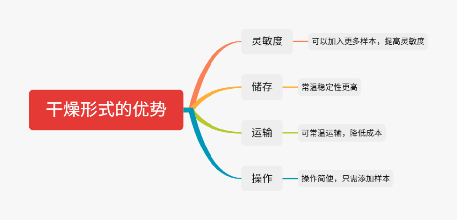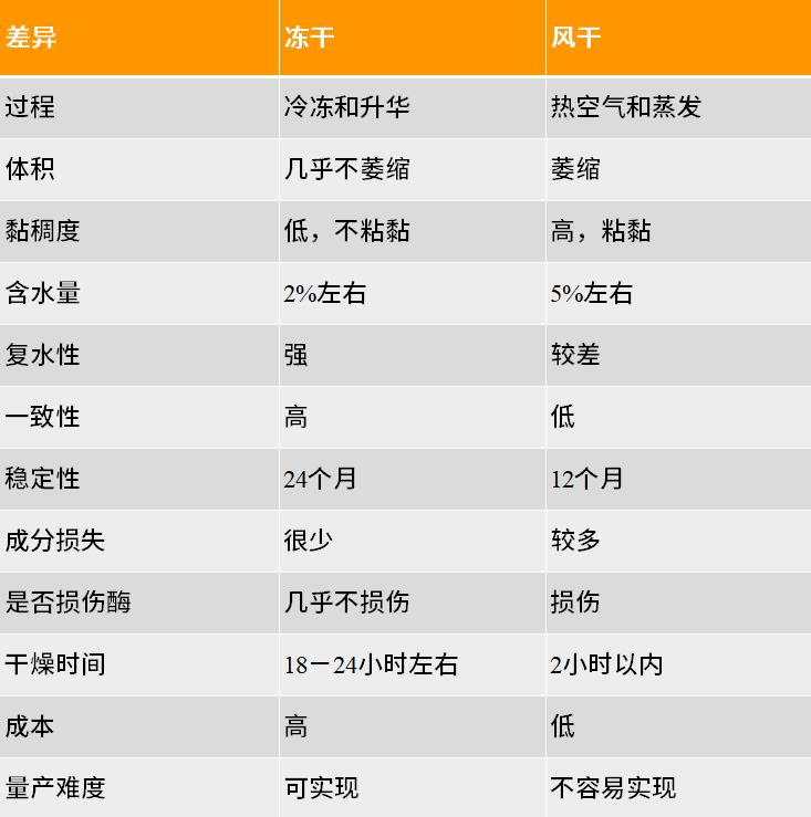 虽然冻干试剂的形式各式各样,但是得益于相同的冻干原理,与风干相比,冻干工艺的优势更加明显:冷冻干燥在低温下进行,因此酶不会发生变性或失去生物活力,活性完整。 由于在冻结的状态下进行干燥,因此体积几乎不变,保持了原来的结构,不会发生萎缩现象。 在低温下干燥时,物质中的一些挥发性成分损失很小,适合试剂干燥。 干燥中无机盐不会在物料表面析出,避免了物料表面硬化。 干燥后的物质疏松多孔,加水后溶解迅速而完全,几乎立即恢复原来的性状。 由于干燥在真空下进行,氧气极少,因此一些易氧化的物质得到了保护。 干燥能排除95%~99%以上的水分,使干燥后产品能长期保存而不致变质。 冻干独特的工艺决定了其独一无二的优势,与风干相比,冻干工艺在许多方面都优于风干工艺,两者之间的主要差异如下: