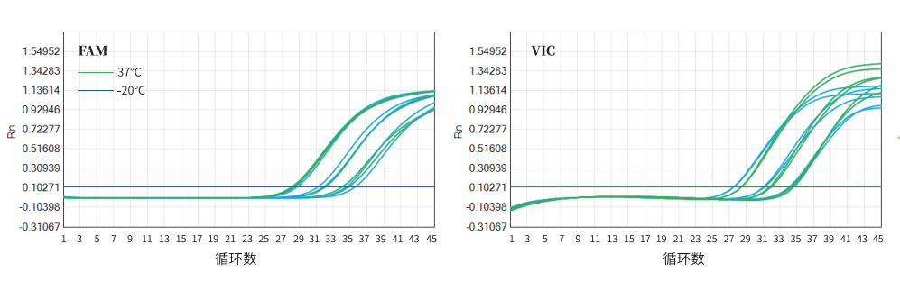 将13775冻干粉分别放置于-20℃和37℃条件下21天,以假病毒为模板进行多重RT-qPCR性能测试。结果表明,冻干粉13775在37℃放置21天后,其外观及性能仍有良好表现。