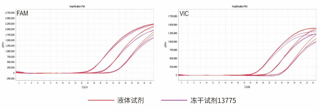 IVD诊断试剂中原料是关键,冻干原料不能直接去掉不可冻干物质,需要针对每个组份进行筛选、调试。因此,翌圣生物在此方面上不断加大投入,力求为客户提供高品质、稳定的可冻干原料,帮助IVD企业快速完成产品研发及生产,快速上市。翌圣生物开发的Hieff Unicon® V Lyo-nCoV Multiplex One Step RT-qPCR Kit (with MgCl2)(Cat#13775)是一种无甘油、即用型的冻干分子诊断试剂,是开发常温稳定、可室温运输储存、多重RT-qPCR的理想选择。对假病毒模板分别使用液体试剂和冻干后13775试剂进行多重RT-qPCR扩增。结果表明,冻干后13775试剂活性完好,且依然具有高效多重反应能力。