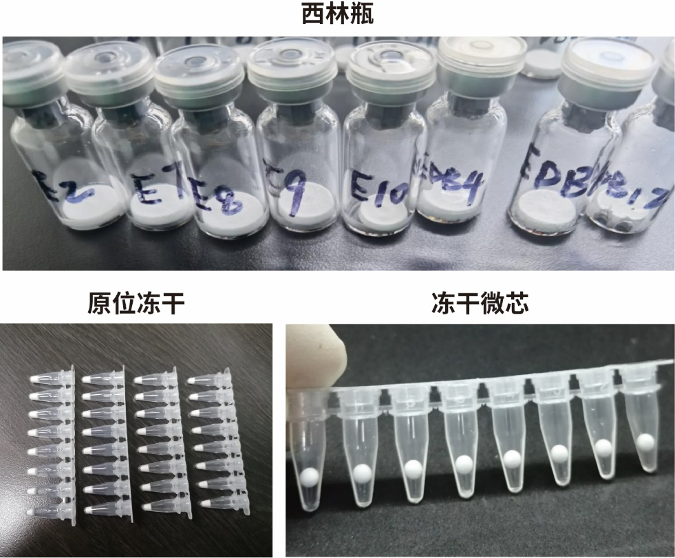 当水蒸汽压大于610.75 Pa时,随着温度的升高,冰融化为水,水再蒸发为水蒸气;当水蒸汽压小于610.75 Pa时,冰加热直接升华为水蒸气。真空冷冻干燥就是利用了水的相变这一原理,先将液体试剂冻结到-30℃~-40℃,使物料中的大部分水分冻结成冰,然后在较高的真空度下,提供低温热源,冰被升华为水蒸气,再用真空系统中的水汽凝结器将水蒸气冷凝,使物料本身留在冻结时的冰架中,从而获得脱水干燥的制品。IVD冻干试剂主要分为西林瓶、原位冻干和冻干微芯三种制剂形式,不同制剂形式,各有优缺点。其中,西林瓶是工业化程度最高的制剂形式,不单有全自动的生产线,并且有完善的验证及风控流程,工艺最简单也最成熟。不足之处在于硼硅西林瓶成本较高,装量不宜太少,而IVD试剂每份的量非常微量,因此一次要装多人份或多次的使用的量,使用不完需要另外保存,便捷性有所欠缺。原位冻干是将试剂的全部组分直接按照单份冻干在试剂盒中,产品使用更加方便。然而冻干机的冷热分布是有偏差的,试剂盒放置位置也不同,因此批件的一致性难以控制。另外原位冻干的设备的使用率非常低,因此摊销成本高,如果大批量原位冻干,冻干微粉又会交叉污染。