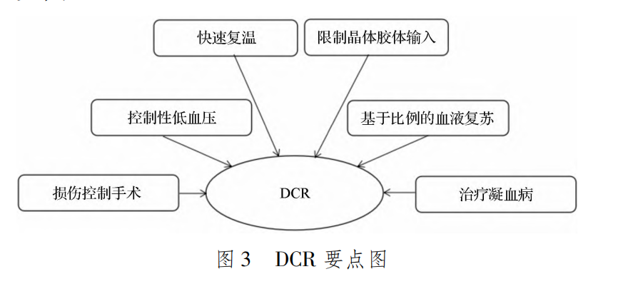 创伤本身的正确处理可以概括为损伤控制性复苏(DCR),即通过损伤控制手术、控制性低血压、快速复温、限制晶体胶体输入、基于比例的血液复苏及治疗凝血病来减少损伤、出血,以改善伤者的预后。见图3。 创伤性出血PBM应高度重视止血异常和凝血功能障碍的及时处理,在创伤性出血PBM的红细胞(RBC)、PLT及凝血因子的管理链条中,PLT及凝血因子的管理处于链条的上游。如果伤者同时存在RBC、PLT及凝血因子的替代治疗指征,应适当优先考虑PLT、凝血因子的替代治疗,目的是减少或避免因止血异常、凝血功能障碍导至的出血。