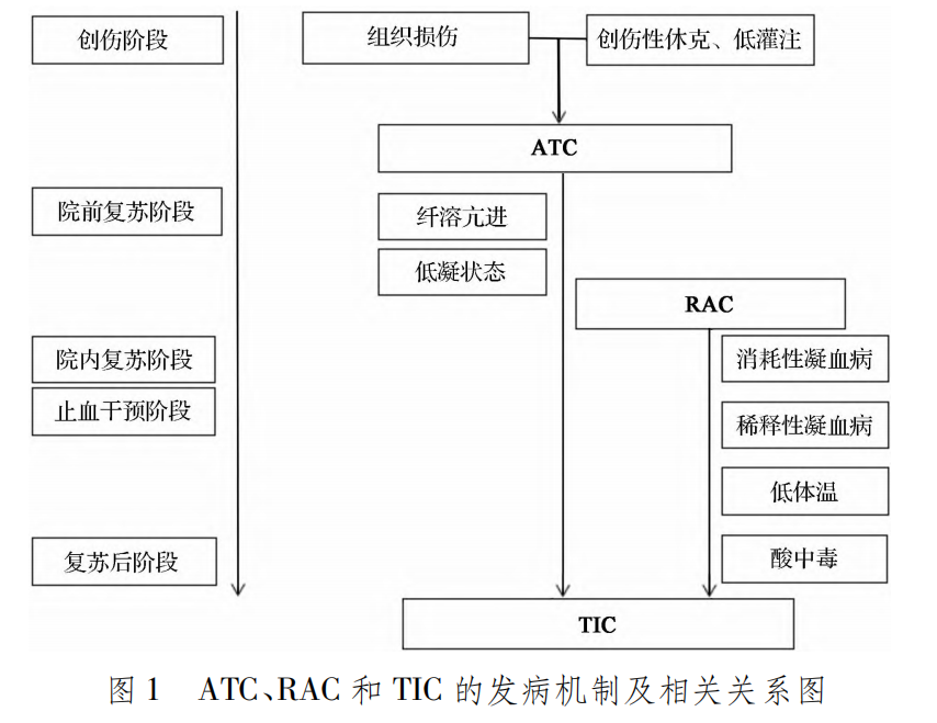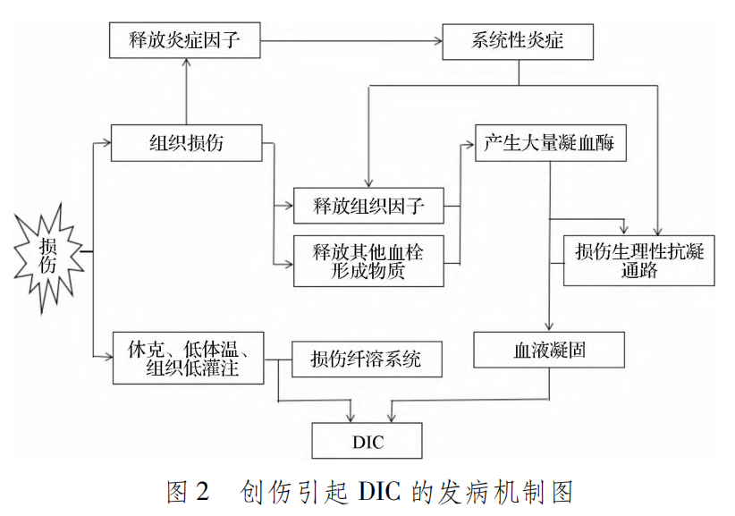 创伤后血管损伤引起的血管性出血是创伤最基本的出血形式。 创伤后的凝血功能障碍包括急性创伤性凝血病(ATC)、复苏相关的凝血病(RAC)、创伤诱导的凝血病(TIC)和弥散性血管内凝血(DIC)。创伤后的这些凝血功能障碍加重伤者的出血,危及伤者的生命。 ATC、RAC和TIC的发病机制及相关关系见图1,创伤引起DIC的发病机制见图2。