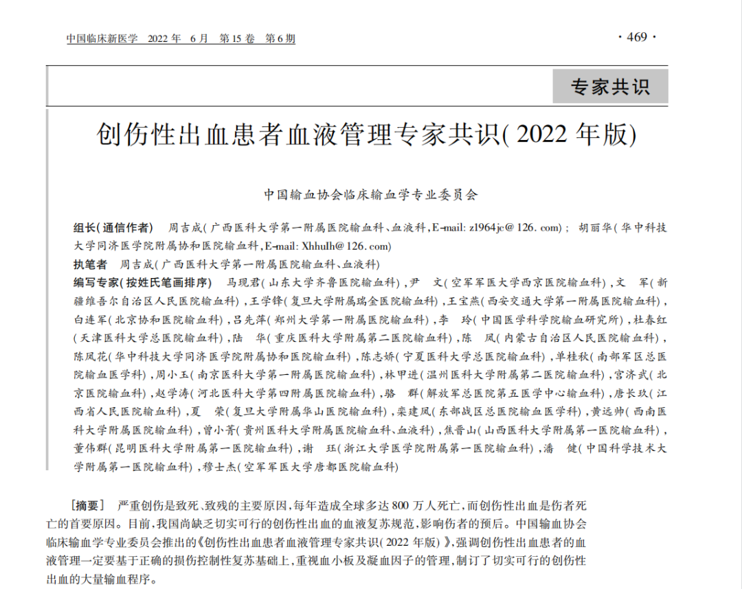 共识速读|创伤性出血患者血液管理专家共识(2022年版)(附全文)