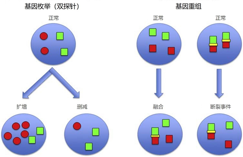 01 探针类型 原则上,存在三种不同的原位杂交探针类型。它们是: 1) 基因座特异性探针,针对感兴趣的特定基因或基因结构。这些靶标通常与肿瘤学的诊断有关,这种探针类型包括枚举探针和易位探针。 2) 另一种探针类型是全染色体涂抹探针,用于在多色荧光原位杂交(FISH)或光谱核型中可视化大型结构性染色体畸变。使用全染色体绘画探针的技术是由细胞学中使用的传统核型技术发展而来。 3) 最后一种原位杂交探针是重复序列探针,用于重复区域或结构的可视化,如端粒、中心粒、RNA物种或病毒DNA。 针对rRNA的重复序列探针可能具有物种特异性,用于通过原位杂交鉴定微生物。 02 位点特定的探针和标签 在福尔马林固定和石蜡包埋(FFPE)组织上进行原位杂交以进行基因座特异性测定时,探针通常由小的双链DNA分子组成,其大小范围明确,低于500bp。荧光标签或aptens通过缺口翻译、PCR或类似技术从修饰过的脱氧核苷酸(如dCTP-荧光素、dUTP-Cy3)加入探针。双链探针与基因组中的靶标区域相同,通过变性和杂交过程,标记的探针与靶标DNA中的互补序列退火。 荧光或明视野显微镜用于探针的可视化,取决于偏好、标签类型和方法设计。荧光探针可以在FISH中直接观察,也可以转换为发色信号,然后用明视野显微镜观察。原则上,所有探针标签类型,如荧光素、Cy3、DNP、地高辛和生物素,都可以通过额外的步骤实现明视野显微镜的可视化,使用抗合剂酶联抗体或链霉菌素来引导色原在标签部位的沉积。 探针和测定设计的一个重要方面是探针是否持有非特异性或重复性序列,这些序列将存在于靶标区域之外。当存在重复序列时,通常需要阻断这些序列以抑制背景并保持测试的特异性。探针设计和商业探针生产的最新发展使得探针不含重复序列。 03 枚举探针 图1 | 荧光原位杂交信号模式的简化图。枚举探针用于量化扩增或缺失的情况。基因重排探针,如融合探针,有助于识别特定的基因融合,而断裂探针表明特定基因的断裂事件。扁平的黄色方块代表绿色和红色的部分重叠信号。 最著名的例子是HER2计数探针,用于测定乳腺癌和胃癌组织中17号染色体上HER2扩增子的拷贝数,具有很大的临床影响。联合使用HER2计数探针和具有不同标签的参考探针可在同一测试中进行,以确定染色体拷贝数的变化,并给出HER2扩增子与17号染色体中心区(CEN-17)的比率。 图2 | 根据HER2 IQFISH pharmDx产品(Agilent Technologies),HER2和CEN-17染色的乳腺癌标本的荧光显微镜图像。HER2扩增子产生来自Texas Red标记的HER2探针的红色信号,而CEN-17区域可以观察到来自异硫氰酸荧光素标记的CEN-17探针的绿色信号。图片代表HER2非扩增乳腺癌标本(左图)和HER2扩增乳腺癌标本(右图)。 图2显示了用Dako品牌的HER2 IQFISH pharmDx产品(安捷伦科技)染色的乳腺癌标本的荧光显微镜图像的真实例子。这些图像表示乳腺癌组织在荧光显微镜的双滤光片中的视图,其中红色和绿色同时被观察到。使用该产品,肿瘤细胞有微弱的红色核背景染色,在HER2非扩增组织(左图)和HER2扩增组织(右图)中均可观察到明亮的红色(HER2)和绿色(CEN-17)的特异性信号。 指示染色体拷贝数的参考探针通常测定相关染色体的中心区域,但也可能被设计为测定非中心区域。原则上,所有驱动致癌基因或肿瘤抑制基因都是原位杂交的候选基因,因为它们可能作为生物标志物具有预测和预后的作用。 04 转位探针(断裂或融合) ALK探针是一种易位探针,用于确定在预定的断点是否发生了DNA断裂。如前所述,该探针说明了2号染色体内的重排情况。这种类型的探针被称为断裂探针或分裂探针。易位测定的原理要求两个或多个探针一起使用(见图1)。 在断裂设计中,两个具有不同标签的探针位于一个已知的DNA断裂点的两侧。在没有DNA断裂的情况下,这些探针将呆在一起,因此它们的标签将在很近的地方被观察到。如果发生了涉及靶标区域之间的断点的易位,探针就会相互分离,这在显微镜下可以观察到间隔的信号。在被调查的肿瘤组织中发生易位事件的频率可以通过计算几个肿瘤核的事件来量化。 由断裂探针检测到的DNA断裂事件可以起到预测作用,如NSCLC中的ALK断裂探针。由于设计的原因,这种类型的探针不能识别重新排列的基因组区域。相反,双融合探针可以识别合并的特定基因组区域(见图1)。双融合探针用不同的颜色标记已知合并的独立基因组区域。在没有被测定的重排的情况下,信号是分开的。如果双融合探针所覆盖的特定重排已经发生,则单色信号消失,观察到合并的信号。 05 传统和寡核苷酸库探针设计 直到最近,现有的探针生成技术需要使用基因组DNA文库,在大肠杆菌或酵母中繁殖一个或多个覆盖人类靶标区域的精选克隆。在用作原位杂交探针之前,要对载体(如宇宙体、细菌人工染色体、P1衍生的人工染色体或酵母人工染色体)携带的人类DNA进行纯化、标记和片段化。尽管使用克隆和标记的人类DNA给测试设计带来了挑战,但这种技术仍被用于HER2列举和ALK重排探针的伴随诊断探针产品。 由于人类DNA同时拥有特异性和重复性的DNA元素,探针的重复性部分可能会因产生背景而影响特异性。重复性元素产生的背景可以通过使用未标记的重复性人类DNA或直接添加到探针中的PNA[17]进行阻断,或在探针生产过程中采用减法,在组织上使用前从克隆的人类DNA中去除重复性元素。最