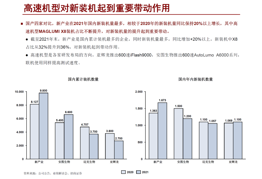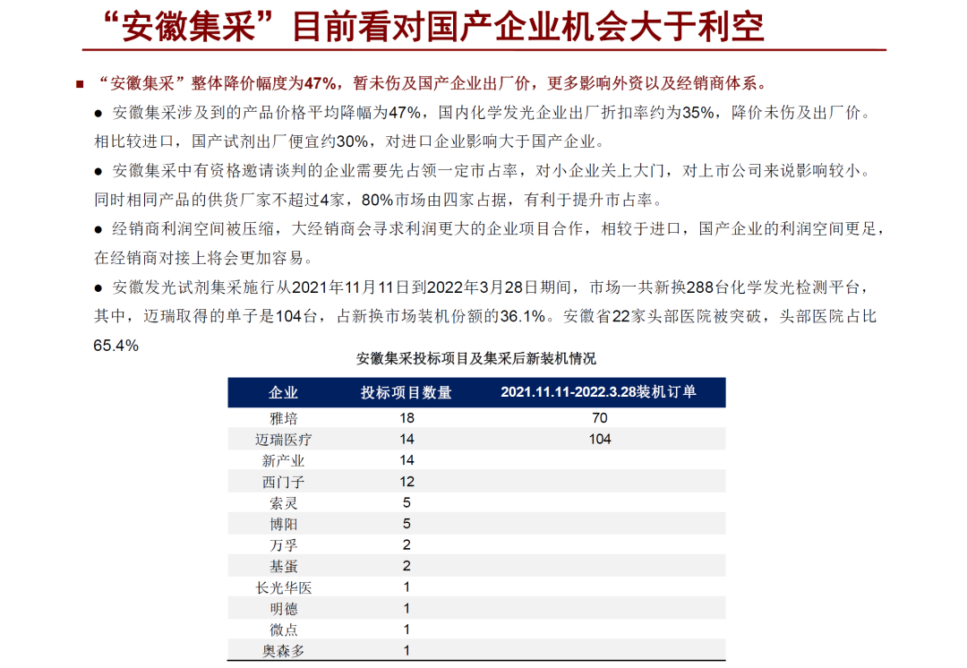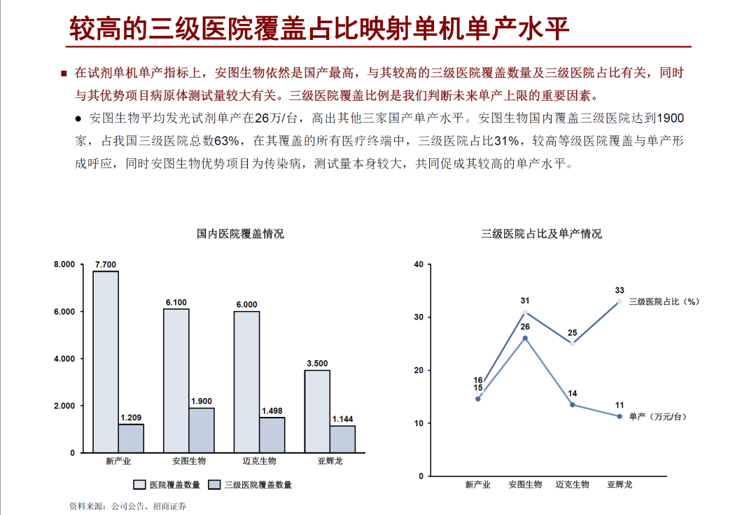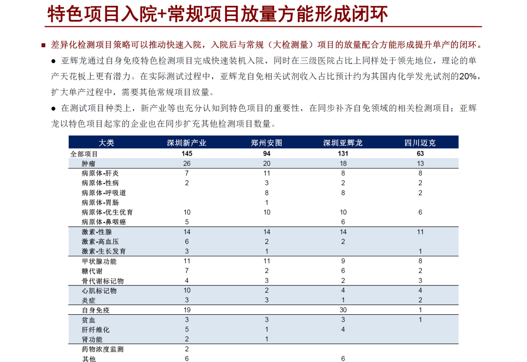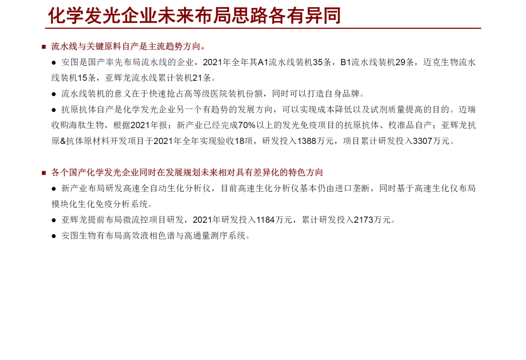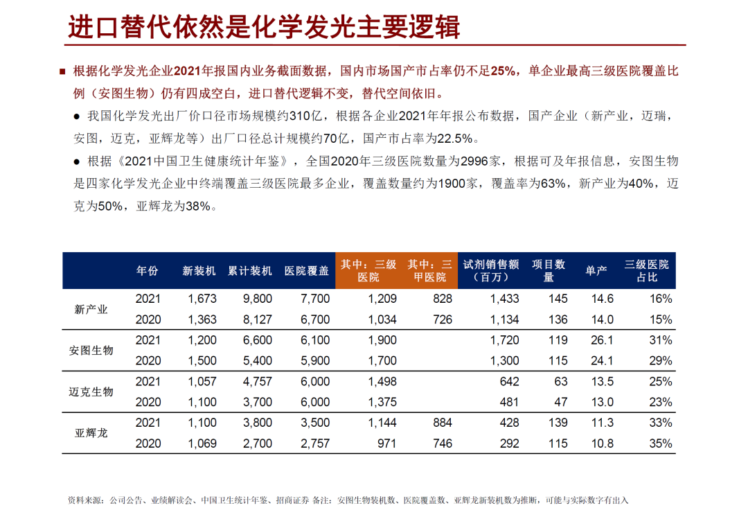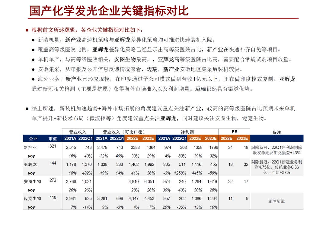 本文内容来源于招商证券,内容供参考,不作为投资指导。 在两年时间内在两年时间内,行业本身经历了如: 1)新冠疫情 2)安徽化学发光集中采购等重大事件的变化影响,同时也衍生驱动业绩增长的新因素; 在行业近两年的发展过程中,我们也注意到行业逻辑中不断被验证的不变的部分。 1 Part.1 不变 ⭐国内市场国产市占率仍不足国内市场国产市占率仍不足25%,进口替代空间仍然很大 ⭐高等级医院占比与单机单产可以形成映射占比与单机单产可以形成映射。 ⭐差异化策略突围差异化策略突围,通过特色项目可装机进入高等级医院通过特色项目可装机进入高等级医院 2 Part.2 变化 ⭐高速机型对新装机起到重要带动作用高速机型对新装机起到重要带动作用。。 ⭐“安徽集采安徽集采””目前看对国产企业机会大于利空目前看对国产企业机会大于利空。。 ⭐需要重视部分企业海外市场的业绩增长需要重视部分企业海外市场的业绩增长 具体内容详见下方PPT资料 |