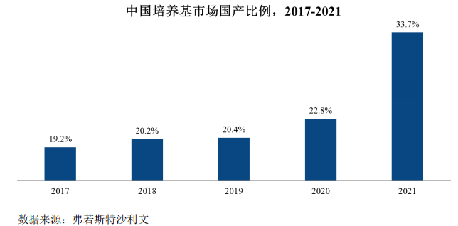 依据弗若斯特沙利文,2021年中国培养基市场规模达到26.3亿人民币,2017-2021年的复合年增长率为44.0%。预计2026年中国细胞培养基市场规模将达到71.0亿人民币,2021-2026年的复合年增长率为22.0%。 中国细胞培养基市场中, 仍以进口品牌为主,三大进口厂商即赛默飞、丹纳赫和默克占比超过60%,澳斯康和奥浦为国产品牌第一、第二位。 随着国产培养基质量的提升以及灵活的市场策略,国产培养基的市场份额从2017年的19.2%预计增长至2021年的33.7%。 2021年在新冠疫苗需求大增以及生物制药快速发展的情况下,澳斯康超过默克,市场占有率由2020年的7.1%进一步增长至12.3%,市场份额排名第三位。