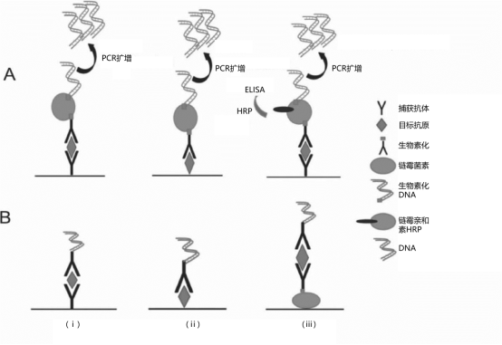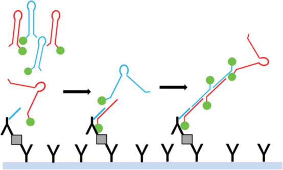 02 基于核酸的信号放大法 核酸扩增方法已被用于提高传统免疫测定的灵敏度,改善信号的产生,从而提高测定的灵敏度。包括聚合酶链式反应(PCR)和包括「实时」PCR(rt-PCR)和免疫PCR(iPCR)、基于核酸序列的扩增(NASBA)、自持序列复制(3SR)和链式置换扩增(SDA)等在内的几种技术,正在实验室环境中广泛使用。下面将讨论一些核酸扩增方法,它们特别适合用于免疫测定应用。 2.1、免疫-PCR 免疫PCR(iPCR)最早由Sano等人描述,已经成为一种成熟的方法,在医疗保健、医学和免疫学中常规使用,用于检测肿瘤标志物、病毒蛋白、病原体、微生物和毒素等。免疫PCR是基于特异性抗体和核酸分子的嵌合体,作为标记物被PCR扩增以产生可检测的信号。 与ELISA相比,这种方法的检测灵敏度可提高1,000-10,000倍,因为它利用了PCR的信号扩增。 一般来说,iPCR系统与传统的ELISA相似,但采用了与DNA标记物相连接的抗体-酶结合物来代替将底物转化为可检测的产物。通过加入核苷酸、特定引物和聚合酶,标记物被放大以增强产生的信号。产生的扩增子的数量与抗原的原始数量有关。已经开发了许多不同的格式,图1中概述了这些格式。 图1 | 免疫PCR中采用的各种方法示意图 (A)免疫PCR通过(ⅰ)夹心法,(ⅱ)直接法,(ⅲ)允许同时进行iPCR和ELISA的夹心法。 (B)通过(ⅰ)夹心法,(ⅱ)直接法,和(ⅲ)带有生物素化捕获抗体的链霉菌素涂层板,用DNA直接连接到检测抗体的免疫PCR。 该方法自推出以来经历了巨大的改进,并进一步发展为实时版本(rt-iPCR)。这种rt-iPCR方法对扩增的PCR产物进行即时、定量的分析,通过直接监测封闭反应容器中的荧光信号,可用于阐明样品中目标蛋白的数量。这样做的另一个好处是取消了额外的扩增后分析步骤,也减少了污染的可能性。 虽然iPCR经常受到灵敏和特异性抗体要求的阻碍,但使用这种技术可以获得巨大的好处。这包括减少所需的样本量,甚至有可能使用替代的样本基质,增加的灵敏度可能允许在以前不可行的地方进行检测,避免了为获得检测样本而进行的侵入性程序。然而,由于需要昂贵的设备,该方法在护理点的应用受到一定限制。 2.2、杂交链反应 一种被称为杂交链反应(HCR)的核酸扩增方法已经被描述出来,它有可能允许使用一对互补的、动力学捕获的发夹式寡聚物进行特定的、「无酶」的延伸。 最近,已经描述了一种适应HCR的方法,即用于检测单细胞分泌的待测物的免疫HCR,它提供了一种替代方法,如酶联免疫吸附点(ELISPOT)或滚动循环扩增(RCA),后者分别在时间和特异性方面受到限制。 图2所示的免疫HCR,利用一对核苷酸为基础的启动子,与特定的抗体相连接,与直接用荧光团标记的抗体相比,改善了对免疫细胞分泌的趋化因子或细胞因子的检测。 观察到灵敏度提高了200倍。这一点,再加上容易与处理微阵列的既定做法相结合,以及多重检测的潜力,使免疫HCR成为一种有希望的等温、不依赖酶的方法,用于放大夹心法中捕获的蛋白质的微观斑点的信号。 图2 | 免疫-HCR的示意图 涂有抗体的玻璃表面可以捕获感兴趣的分析物。引入用寡核苷酸引发剂标记的二级抗体,并与目标分析物结合。荧光标记的DNA毛细管随后与它们互补的寡核苷酸起始物杂交。在HCR过程中,每个结合的抗体的荧光信号随着带有荧光团的发夹的增加而增加。 2.3、环介导等温扩增法 环介导等温扩增法(LAMP)是一种核酸扩增方法,为检测和鉴定疾病提供了一种快速、准确和具有成本效益的诊断工具。 LAMP是一种高度灵敏和特异的一步扩增方法,在等温条件下扩增目标DNA序列。该方法采用Bst DNA聚合酶,它表现出链置换活性,通过扩增目标DNA中的六个远端区域而发挥作用。只有当目标DNA中的所有六个区域都被引物识别时,才会发生扩增,这就赋予了它高度的特异性。 LAMP方法有许多特点,使其优于其他类似方法。首先,与其他基于PCR的方法不同,LAMP不需要高精度的热循环设备,因为它使用的是等温酶。其次,简化的反应发生在一个试管中,可以通过浊度或荧光等多种方式监测和确认阳性反应,不需要复杂或耗时的扩增后分析。 这些特性使LAMP成为一种非常有吸引力的方法,用于在没有复杂设备和高技能人员的情况下诊断疾病和感染。Lee等人描述了LAMP方法的一个非常有趣的修改,概述了用于检测病人样本中结核分枝杆菌的反转录环路介导的等温扩增-酶联免疫吸附杂交(RT-LAMP-ELISA)测定。 通过这种技术,作者详细介绍了一种快速、「单管」检测患者活动性肺结核的方法,以及从单个痰样中区分结核杆菌和其他分枝杆菌的能力。 03 光学检测方法 光学检测依赖于吸光度、荧光或发光的读数,有许多仪器(如平板阅读器和玻片扫描仪)可供选择,这些仪器可以方便和快速地进行测量。随着降低现有免疫测定的检测限和提高灵敏度的动力不断增强,新的检测策略也在不断发展,特别是在荧光检测领域。下面将讨论一个创新的荧光检测方法及其应用的例子。 其他基于全内反射的光学检测方法,如全内荧光(TIRF)、全内反射椭圆仪(TIRE)和纤维光学的使用,已被描述为改善信号检测的方法。超临界角荧光(SAF)被描述为一种光学检测方法,与其他检测系统相比,可以提高灵敏度。 它基于图3所示的原理,即入射光线在水玻璃界面上被折射成低于临界角的角度,这意味着没有光线应该进入超临界角。然而,与玻璃表面结合的荧光体可以向超临界角