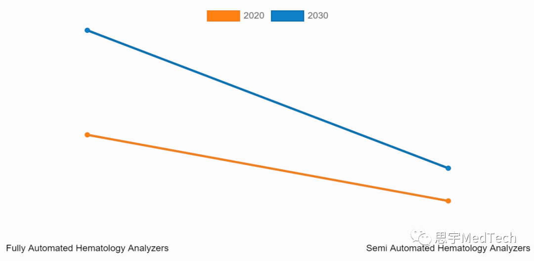 2、按类型分为全自动血液分析仪和半自动血液分析仪 按产品种类角度,全自动血液分析仪细分市场在2020主导了全球市场,预计在预测期内将继续这一趋势。这归因于对自动化血液学仪器的日益偏好,以及技术进步的增加,以及自动化血液学分析仪中基本流式细胞术技术的结合。 ▲血液分析仪市场-按类型