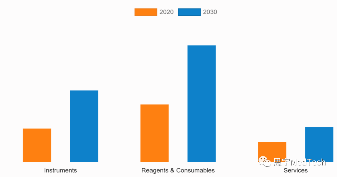 (一)血液分析仪市场细分 1、 按产品和服务分为仪器、试剂和耗材、服务 按产品类型角度,试剂和耗材是血液分析仪市场的主要部分,原因包括临床实验室采用试剂和耗材用于血细胞计数、凝血测试、其他血液学测试、控制和校准。 ▲血液分析仪市场-按产品和服务