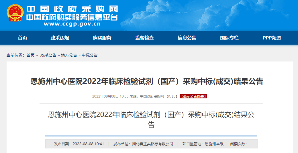 8月8日,据中国政府采购网公开信息,恩施州中心医院2022年临床检验试剂采购中标公告正式发布。 恩施州中心医院于1998年10月由原恩施州人民医院和恩施州民族医院合并组建而成,是恩施州及周边地区第一所集医疗、科研、教学和保健于一体的三甲医院。2017年,医院综合实力位居全省医疗机构第一方阵,跻身“中国医院竞争力排行榜”全国地市级医院百强,在全国30个少数民族自治州中榜首。 三甲医院采购国产试剂已成为大趋势,据公告显示,此次恩施州中心医院采购中标的临床检验试剂均为国产,中标金额累计达2420万,其中湖北锦航生物科技有限公司生产的精准实验室基因测序试剂独中1000万大标! 以下为中标公告的具体内容: 一、项目编号 HBZSZB-2022-96043 二、采购计划备案号 0011-FSCG-2022-00034 三、项目名称 2022年临床检验试剂(国产)采购 四、中标(成交)信息 包名称:精准实验室流式细胞试剂 供应商名称:湖北锦航生物科技有限公司 供应商地址:湖北省恩施土家族苗族自治州恩施市舞阳坝街道耿家坪村金桂大道162号 中标(成交)金额:100(万元)
