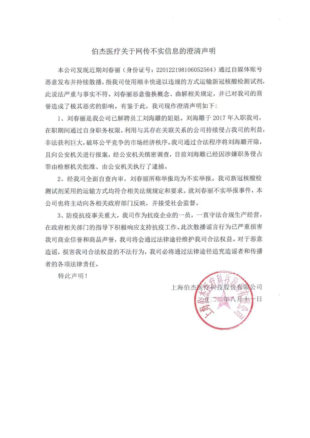 2022年8月10号中午,根据某音视频,一女子在近日手举身份证实名举报:“某家公司,明知试剂盒必须全程在-15°C至-25°C的条件下存储和运输,未使用全程温控的运输方式,仅在包装箱内加冰袋,无法保障试剂盒温度和试剂盒的有效性。 仅2021年1月-2022年1月,涉及5819单,约为749567盒,总人数约为39331440份,金额约245753380元”。 对于举报内容是否属实,通过视频无法看到有效证据。 根据临检中心多次公布的质评报告来看,伯杰医疗在实验室的新冠核酸试剂产品占有率排行业第二。 对于该女子举报内容,伯杰医疗已出了一份声明说明情况。 关于伯杰医疗 上海伯杰医疗科技股份有限公司是一家专注传染性病原体诊断试剂研发和应用,深耕于多重荧光PCR诊断试剂、分子诊断仪器和病原体测序技术服务的高新技术企业。已自主研发400多种核酸检测试剂、12种核酸提取试剂、5款仪器设备,已取得11项国内医疗器械注册证/备案凭证。为应对新冠疫情,公司紧急研发出的新型冠状病2019-nCoV核酸检测试剂盒(荧光PCR法)成为国内首批三个获得国家三类注册证的产品之一。在未来的发展中,伯杰医疗将继续秉持初心,坚守创新引领、质量为先,在感染性病原体诊断领域全面布局,为相关的疫情应急检测、临床门诊筛查、病房精确诊断和疑难重症病因确诊等提供全套的高水准的解决方案。 |