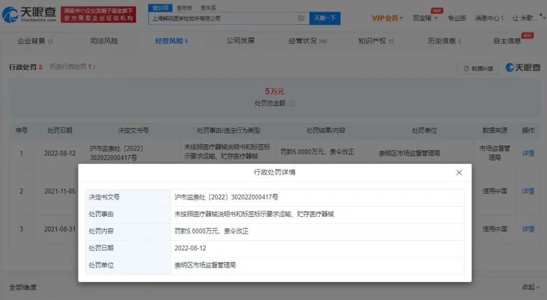 近日,上海解码医学检验所有限公司因未按照医疗器械说明书和标签标示要求运输、贮存医疗器械,违反《医疗器械监督管理条例》相关规定,被崇明区市场监督管理局罚款5万元。