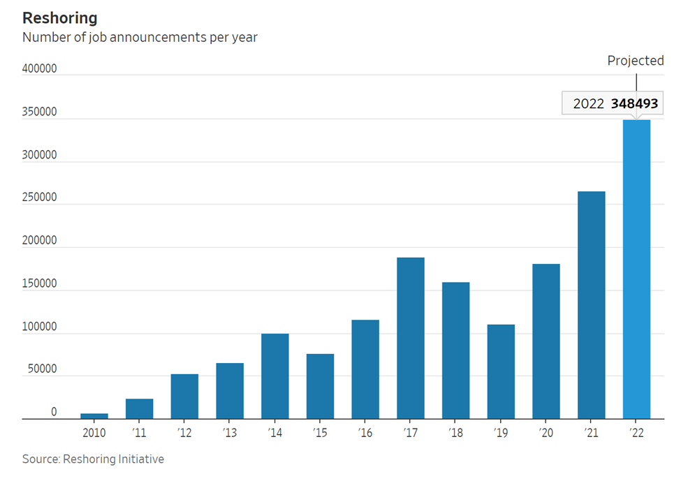 据华尔街日报8月20日报道,由于新冠疫情造成全球供应链破裂的影响,美国海外企业正以前所未有的速度将工厂和工人迁回美国。 根据美国工作回归倡议协会(Reshoring Initiative)的报道,2022年美国将迁回(reshore)35万的工作岗位回美国。这是该协会自2010年来开始跟踪美国工作回迁数据以来的最高数值。去年这个统计数据是26万人,增加了34%。而2010年,这个数值只有6000人。回归倡议协会是美国一个非盈利组织,聚焦帮助美国企业将部署在海外的制造和服务工作迁回美国。他们宗旨是改变美国企业主对于外包依赖。他们的口号是:From “offshoring is cheaper” to “local reduces the total cost of ownership.” 从外包的成本降低,转变到本地化成本的降低。提倡供应链的安全和稳定,也就是说未来制造业成本降低不再是最重要的考虑。