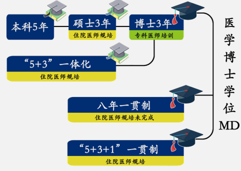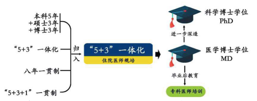 中国的医学博士到底意味着什么? ▲图3 王松灵建议的临床医学博士及相关学位授予体系的模式 | 图源[1] 8年 “拔尖”? 注释: 1.雷丽萍,武艳,李文斌,路孝琴,王松灵.面向发展需求 重构我国医学教育学制学位体系[J].医学教育管理,2020,6(03):225-230. 2.黄子杰,李跃平.中国高等医学教育学制的历史演变与启示[J].西北医学教育,2007(06):973-975+978. 3.徐薇薇,张勤,管远志,闫宏宇,涂文记,高小惠,杨萍,潘廷芳,马超.国内八年制临床医学教育体系的现状和展望[J].医学教育管理,2017,3(03):187-190+213. 4.武艳,赵颖,谢千池,吴萍,雷丽萍,朱淼,赵丽莉,朱庆双,路孝琴,王松灵.我国高等医学院校医学人才培养体制现状调查与分析[J].医学教育管理,2021,7(02):196-200. 5.杨辉,韩建军,许岩丽,高晓欢,汪洋,杨允利,曹新阳.中国全科医学行业十年发展:机会和挑战并存[J].中国全科医学,2022,25(01):1-13+28. 6.路孝琴,杜娟,武艳,雷丽萍,李文斌,吴浩,王松灵.构建我国长期可持续发展的全科医生培养体系[J].医学教育管理,2020,6(03):231-238. 7.范学工,李亚平,胡卫锋,毕晓燕,梁莉.我国八年制与美国4+4医学博士招生与培养的比较[J].复旦教育论坛,2011,9(03):93-96.DOI:10.13397/j.cnki.fef.2011.03.001. 8.胡东亮,胡万里,刘同族,王行环.提高八年制医学生科研能力的培养策略思考[J].中国社会医学杂志,2020,37(01):25-27. 9.杨铭,陆治幸,林昌伟.中南大学湘雅医学院临床医学八年制培养方案改革探析[J].中国继续医学教育,2022,14(05):31-35. 10.吴凡,汪玲.专稿我国医学教育70年成就与新时代改革路径思考[J].中国卫生资源,2019,22(04):254-257.DOI:10.13688/j.cnki.chr.2019.19471. 11.吴凡,汪玲.构建新时代“MD+PhD”医学教育新模式[J].中国卫生资源,2021,24(02):111-115.DOI:10.13688/j.cnki.chr.2021.210330. 12.http://www.cmm.zju.edu.cn/2021/1102/c38704a2437917/pagem.htm 13.https://xysm.csu.edu.cn/old/info/1013/5409.htm 14.饶毅,中国医学教育:八大亟需关注的系统性问题及其解决办法,饶议科学,2021.9.21 · END · |